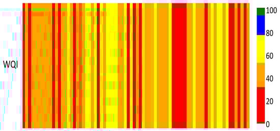 Figure 7 depicts the WQI gauge, which visually represents and evaluates water quality by integrating various pollution indicators. This gauge accurately represents the mean WQI as a numerical value of 40 on a scale from 0 to 100, where higher values indicate superior water quality. The incorporation of a multi-colored gauge improves data clarity. The red color indicates very poor water quality (WQI 0–31). The orange color signifies a medium water quality level, ranging from 31 to 52. The brown color signifies a moderate quality level, ranging from 52 to 77, and the blue color shows a high-quality level, with values ranging from 77 to 93. Meanwhile, the green color indicates a notable water quality level, ranging from 93 to 100.