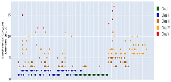 Figure 10 illustrates a clear triangle membership function for biochemical oxygen demand (BOD). The plotted data points indicate that most BOD values generally range from 6 to 8 mg/L, with most observations falling within the Class III category. The BOD level signifies a moderate degree of organic pollution, potentially supporting more resilient species while posing risks to sensitive aquatic organisms. Exceptional water quality conditions, characterized by low BOD, are suggested to be rare in the measured water body, as indicated by the limited number of data points that approach the low BOD levels typical of Class I. BOD serves as a critical metric for assessing water quality, as it quantifies the oxygen demand necessary for aerobic organisms to decompose organic matter in aquatic environments. To prevent future degradation of water quality, monitoring and potentially mitigating sources of organic pollution may be essential, as evidenced by the recurrent occurrence of Class III situations. The regions of overlap between Class II and Class III curves indicate transitional zones in which certain BOD values are partially linked to multiple classifications. The overlaps demonstrate the adaptability of fuzzy logic, facilitating gradual transitions between classes rather than sharp delineations. The increase in BOD concentration results in a progressive shift in membership toward higher classes, with Class V indicating the most polluted conditions at the highest concentration.