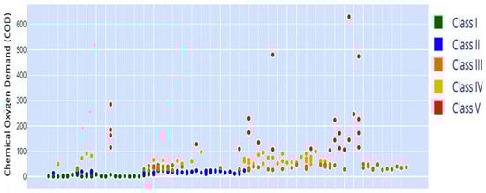 Figure 11 illustrates various fuzzy membership functions for COD values, which range from 0 to over 600 mg/L, corresponding to Classes I through V. The plotted data points indicate a concentration of observations primarily within the Class II zone, suggesting that the majority of COD levels are situated in a moderate range. This indicates that while certain pollutants are present in the water, they typically do not fall into the most severe categories. Extremely low or high COD levels are improbable, as indicated by the absence of data points in the lowest and highest categories (Class I and V), suggesting a degree of natural or regulatory control over the sources of chemical pollutants. The overlapping regions between adjacent classes, such as Class II and Class III, demonstrate transitional zones where COD concentrations are partially ascribed to multiple classes. The transitions facilitate flexibility, enabling a nuanced classification of water quality according to COD levels. The rise in COD levels results in a gradual transition in membership to higher classes, with Class V indicating the most polluted conditions at elevated COD concentrations.