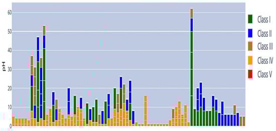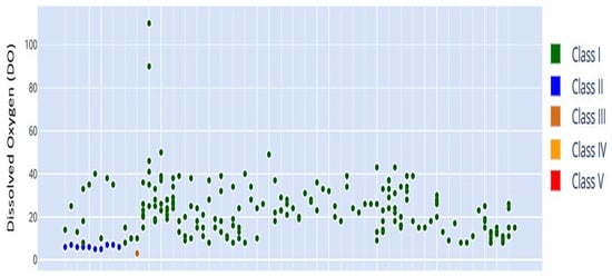 Figure 12 presents fuzzy membership functions for Classes I to V, which include DO values from 0 to 100 mg/L. The current data points primarily fall within Class IV, suggesting that dissolved oxygen levels often remain at a threshold that is only marginally adequate for supporting aquatic life. The data suggest that while extreme oxygen depletion (Class V) occurs infrequently, optimal conditions (Class I) are similarly rare. The absence of points in the highest category indicates a need for interventions to enhance oxygen levels, likely due to organic pollution or eutrophication affecting the water body. Overlapping regions between classes, such as Class II and Class III, exhibit transitional zones that permit specific DO concentrations to be partially associated with multiple classes. A soft classification facilitates a gradual transition among water quality levels. As dissolved oxygen concentrations decline, the community composition shifts progressively toward higher classes, with Class V representing the most oxygen-depleted and polluted conditions.