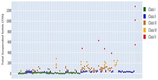 Figure 13 presents various fuzzy membership functions for Classes I to V, encompassing TSS concentrations ranging from 0 to over 500 mg/L. The data points predominantly cluster in the Class I zone, suggesting that most TSS readings are low. This indicates that the water quality is predominantly favorable for suspended particles. The clustering indicates that the water bodies maintain transparent conditions advantageous for aquatic species and human activities. A limited number of data points are classified as Class II, with even fewer attaining higher classifications. This suggests that instances of elevated TSS are rare but do happen, which may indicate the occurrence of sporadic pollution events or specific issues at certain sampling locations. Low TSS levels (Class I) indicate minimal disturbance, which supports stable ecological processes.
