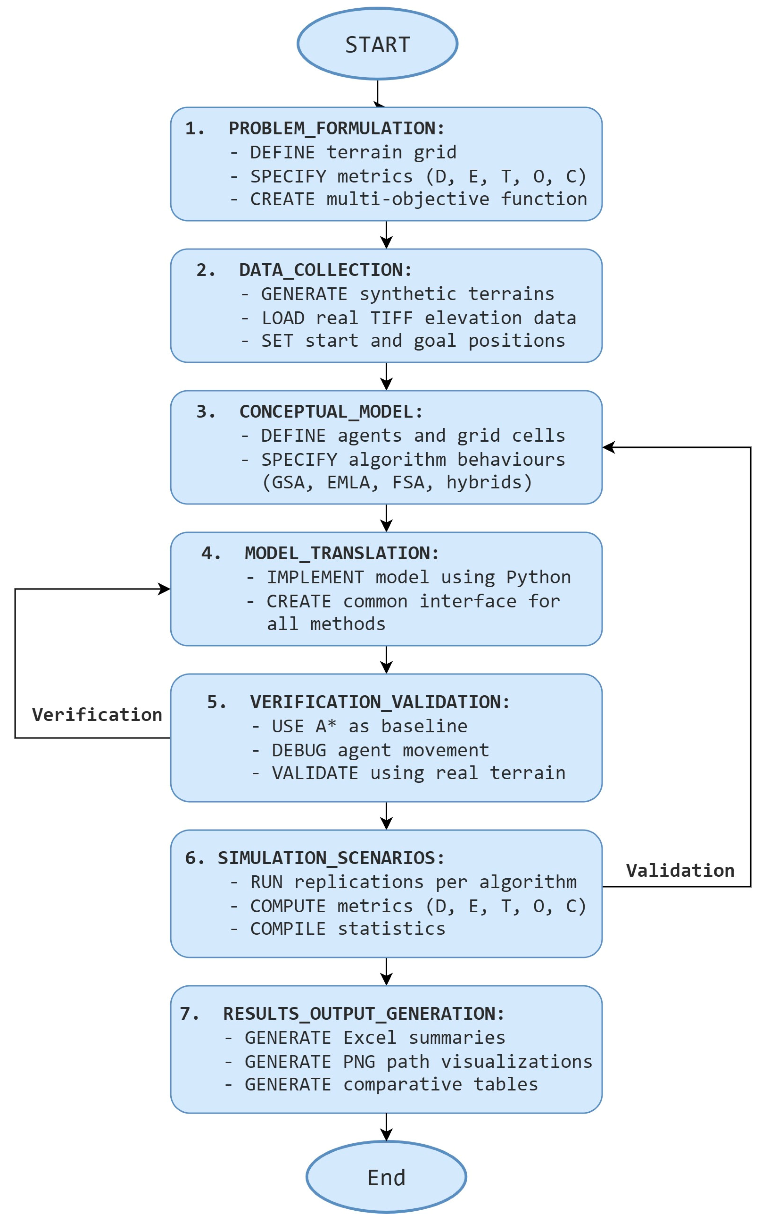 Each code of an algorithm was initialized with the population, number of iterations, density of the obstacles, grid size, start point, goal point, and the weights of D, T, E, O, to compute the cost C. The codes are written in the Python programming language. The output includes the values of five metrics and the optimal paths.