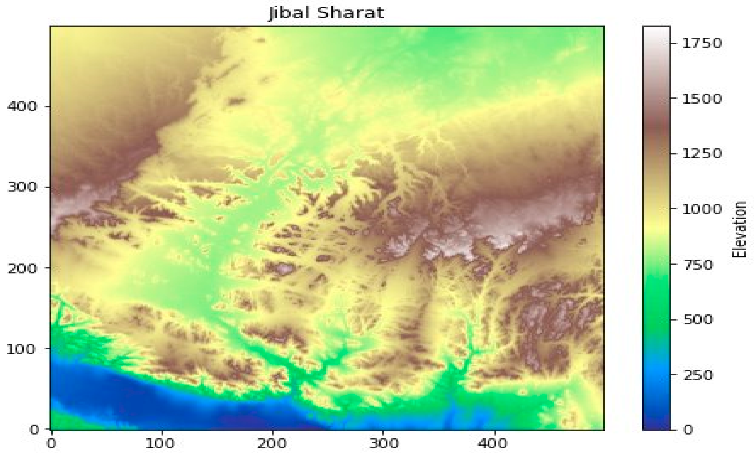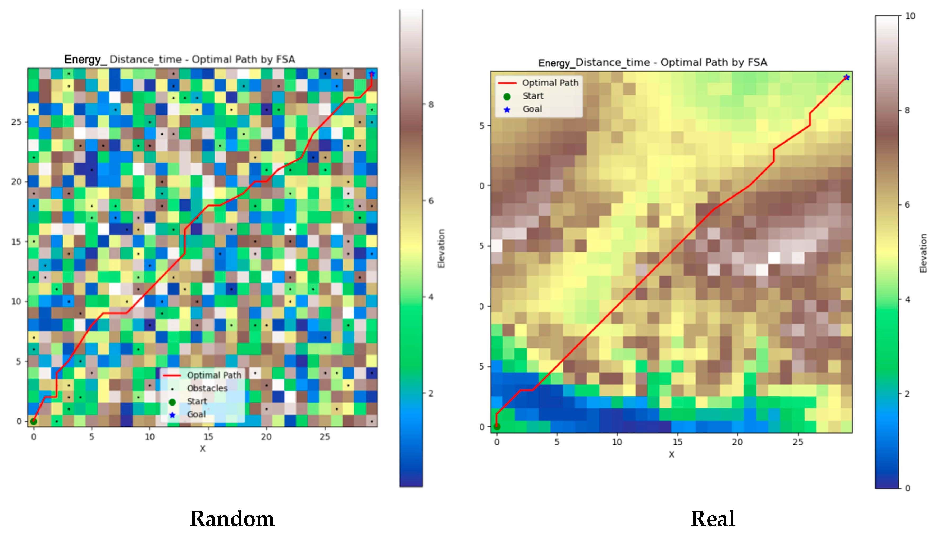 Figure 12 illustrates samples of optimal path visualization for implementing the FSA optimization algorithm in both synthetic and real terrains (Jibal Sharat, Jordan), based on a weighted multi-objective fitness function with grid 100 × 100 and the specification as in