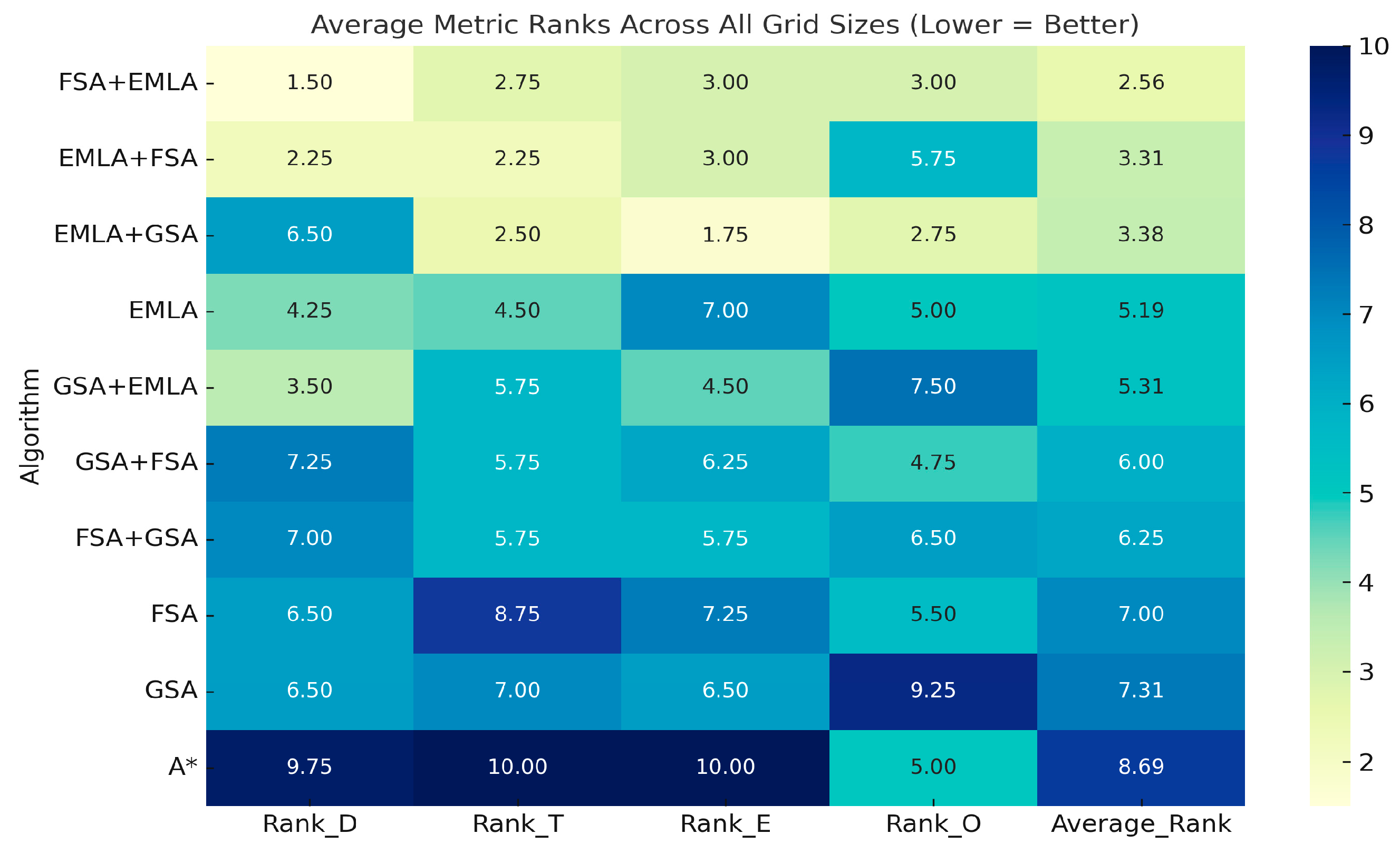 Since the weight cost depends on the importance of each metric, we computed the rank of each algorithm for each metric across all grid sizes and then ranked each algorithm by the average rank.