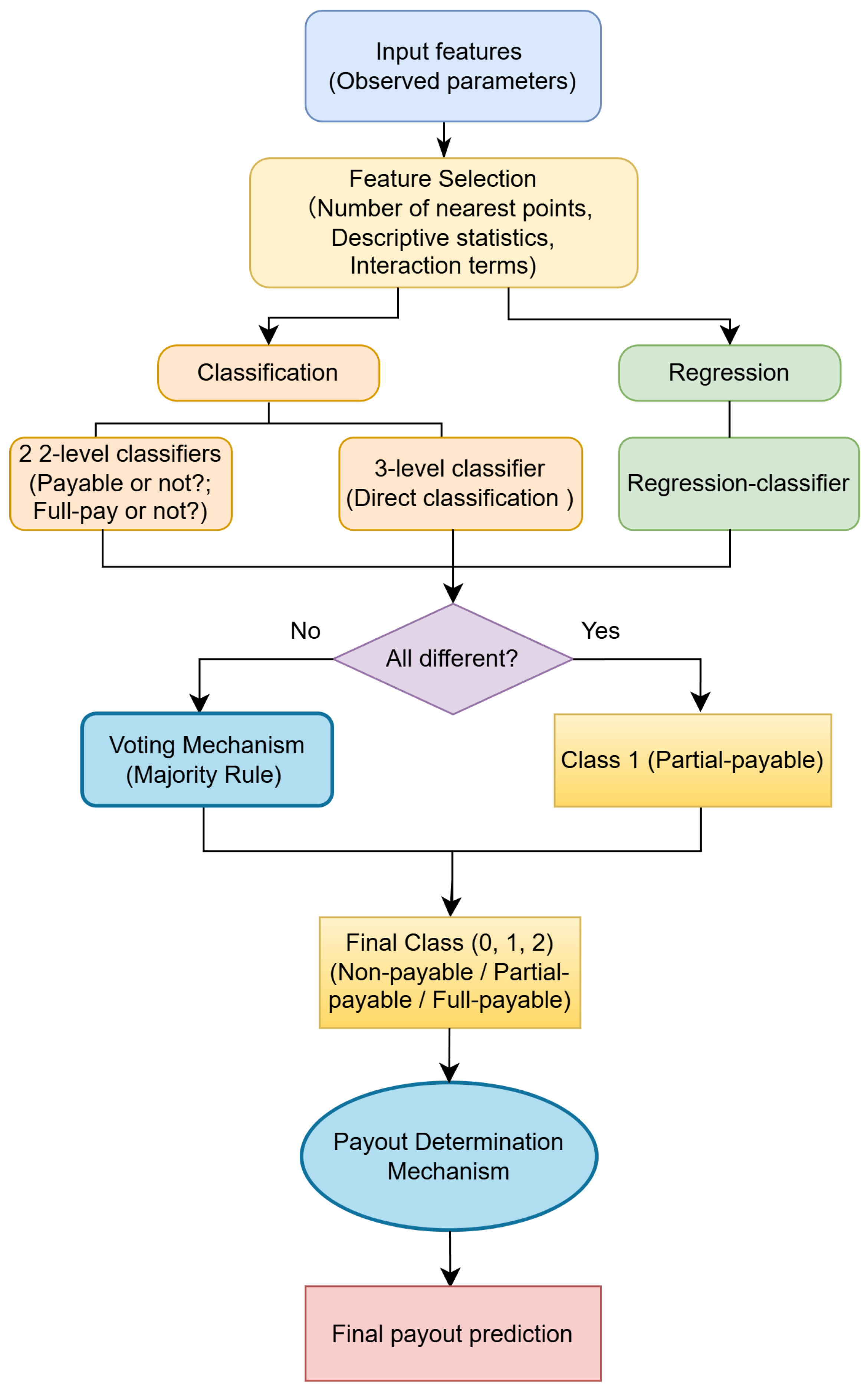 Section 3, the final payment amount was predicted on the basis of the final classification after the vote and numerical predictions of a regression model. If the agreed class is 0, i.e., ‘non-payable’, the final payout is 0; if the agreed class is 2, i.e., ‘fully payable’, the final payout is the upper bound of the payable loss. The rest are considered as class 1, i.e., ‘partially payable’, and the regression as a classifier is also classified as 1; the predicted payout is the loss predicted by the best regression model referred to in