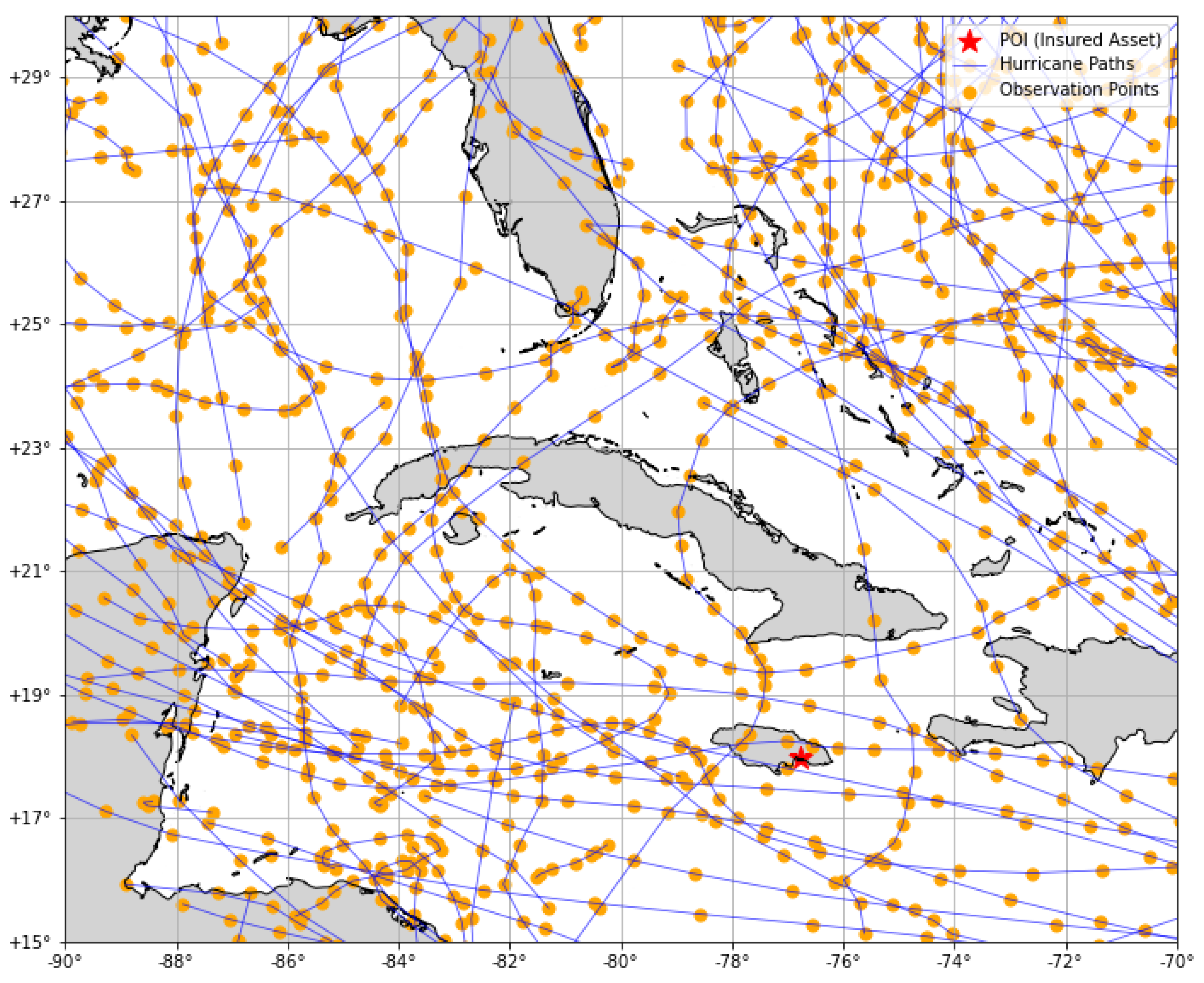Figure 3 and overlaid with a sample set of hurricane paths simulated with the catastrophe risk model. These synthetic events have estimated losses associated with the considered exposure as well as physical parameters for multiple observations along the path over time. The dots in the figure represent observational points of the hurricanes at different times, with a time step of 6 h. Thus, each hurricane shown in the figure is associated with a data pair containing information on the losses of the insured asset caused by the hurricane and its physical parameters. These include, at each observation point, the longitude and latitude of the eye of the cyclone, its MWS in kt units, its MSLP in mbar units, and its RMW in km units.