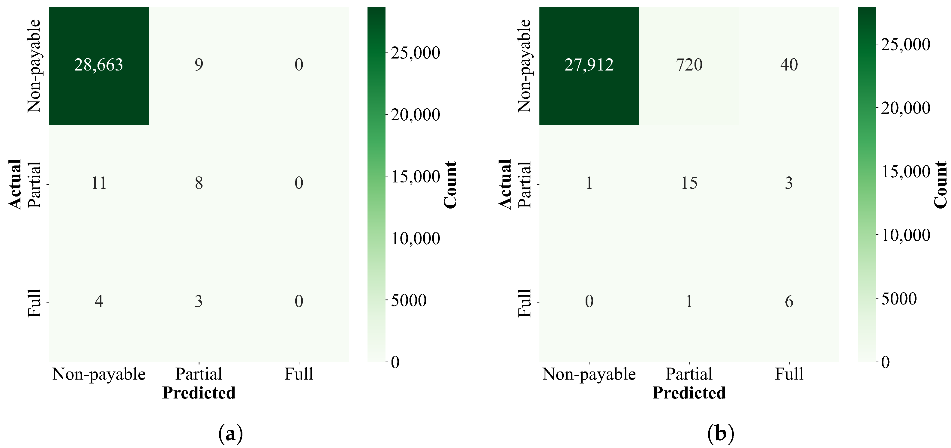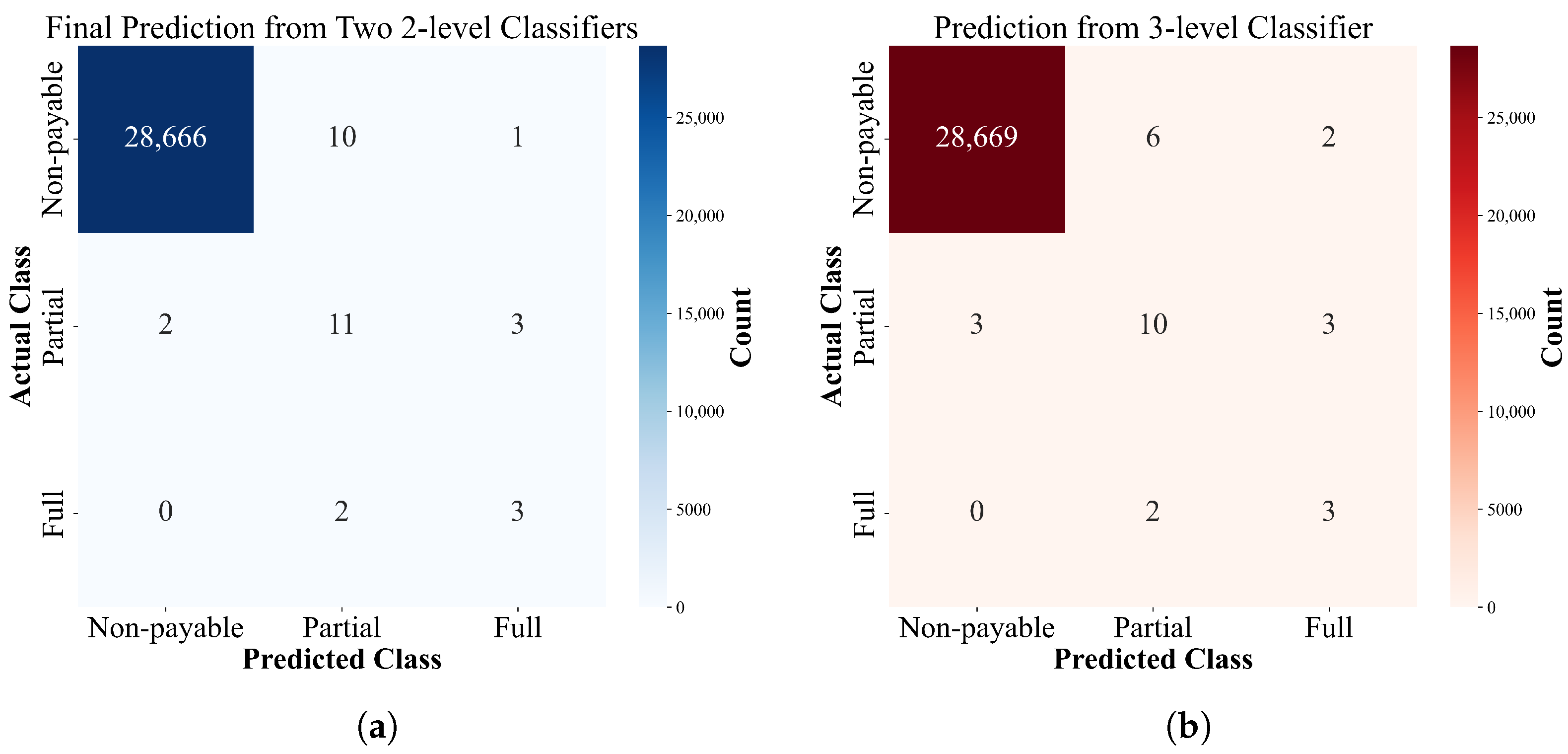 Figure 4 shows the performance on each class through their respective confusion matrices. It is interesting to note that the direct three-class classifier yields fewer misclassifications on ’non-payable’ events, yet it tends to make the more significant mistake of misclassifying ’non-payable’ events as ’fully payable’.