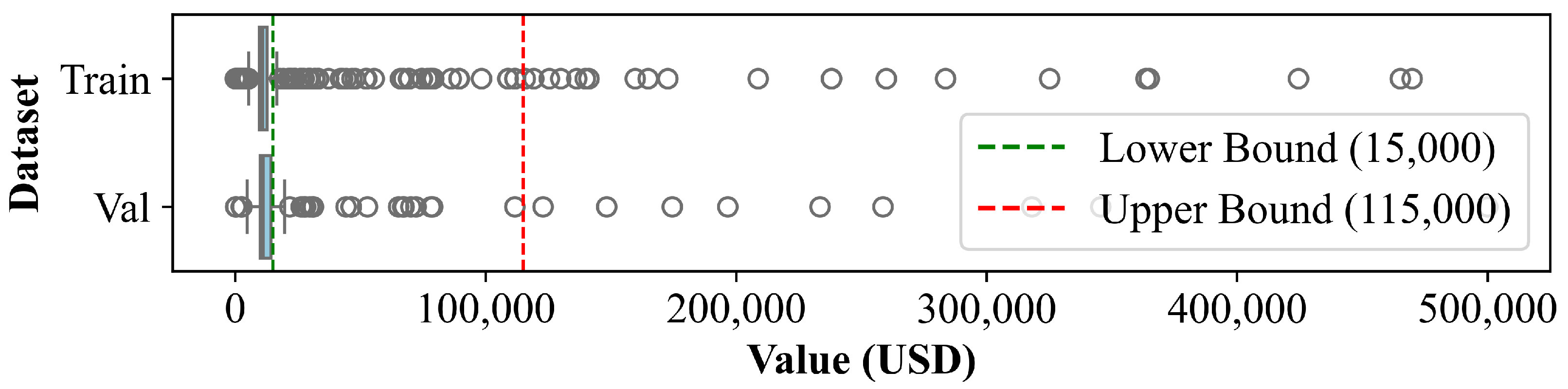 Figure 5 shows the box plots of the original training and validation sets filtered for the regression model with the stated lower bound and upper bound as reference lines. Events that are payable (i.e., reach the lower losses bound for payout) are essentially identified as outliers.