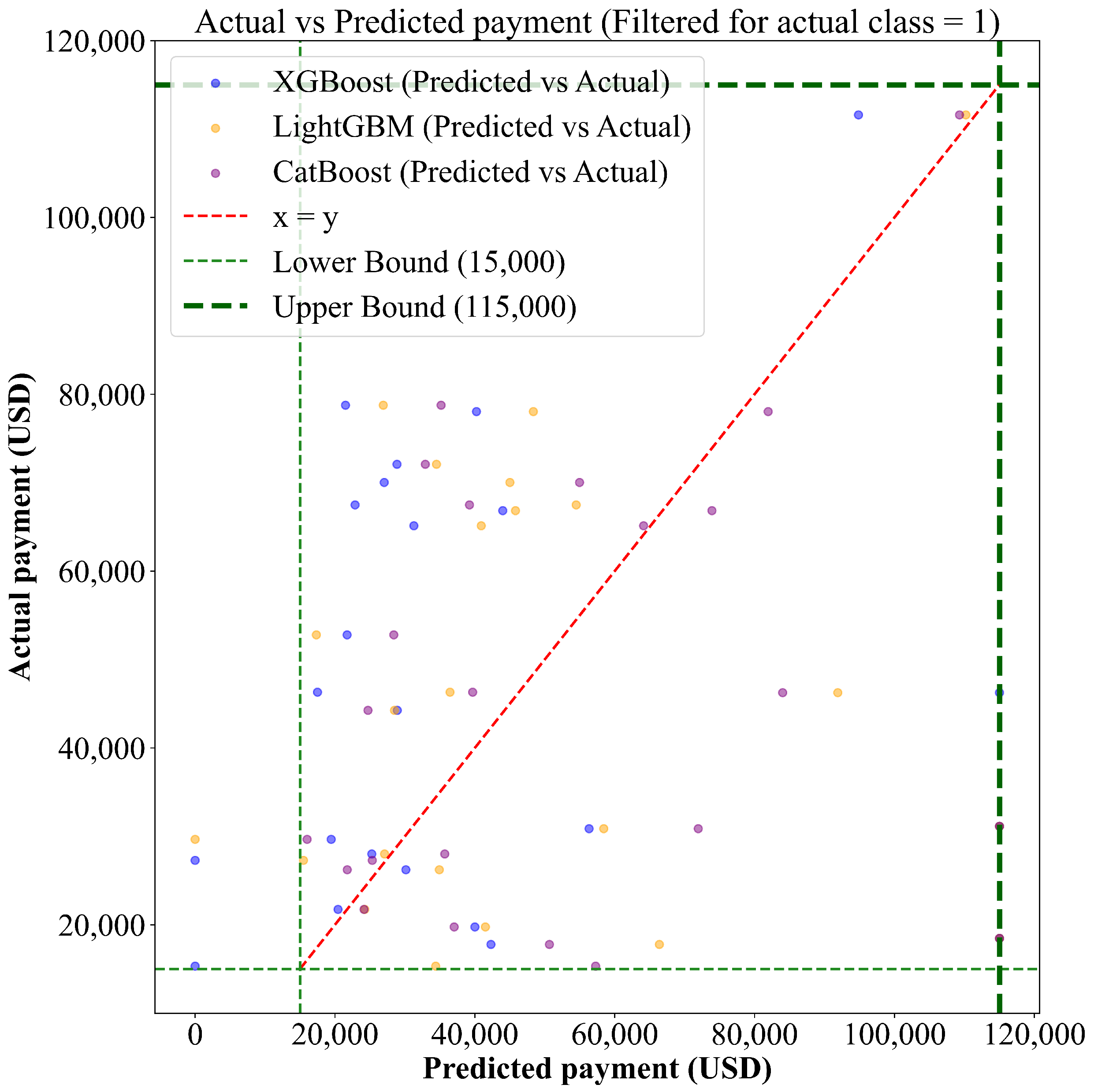 Figure 6 visualize the actual payment versus predicted payout from the different regression models for the events with the category of partial payment, i.e., the actual class equals 1, under this kind of pre-processing and feature selection. The purple points are the prediction performance of the best CatBoost-trained model.