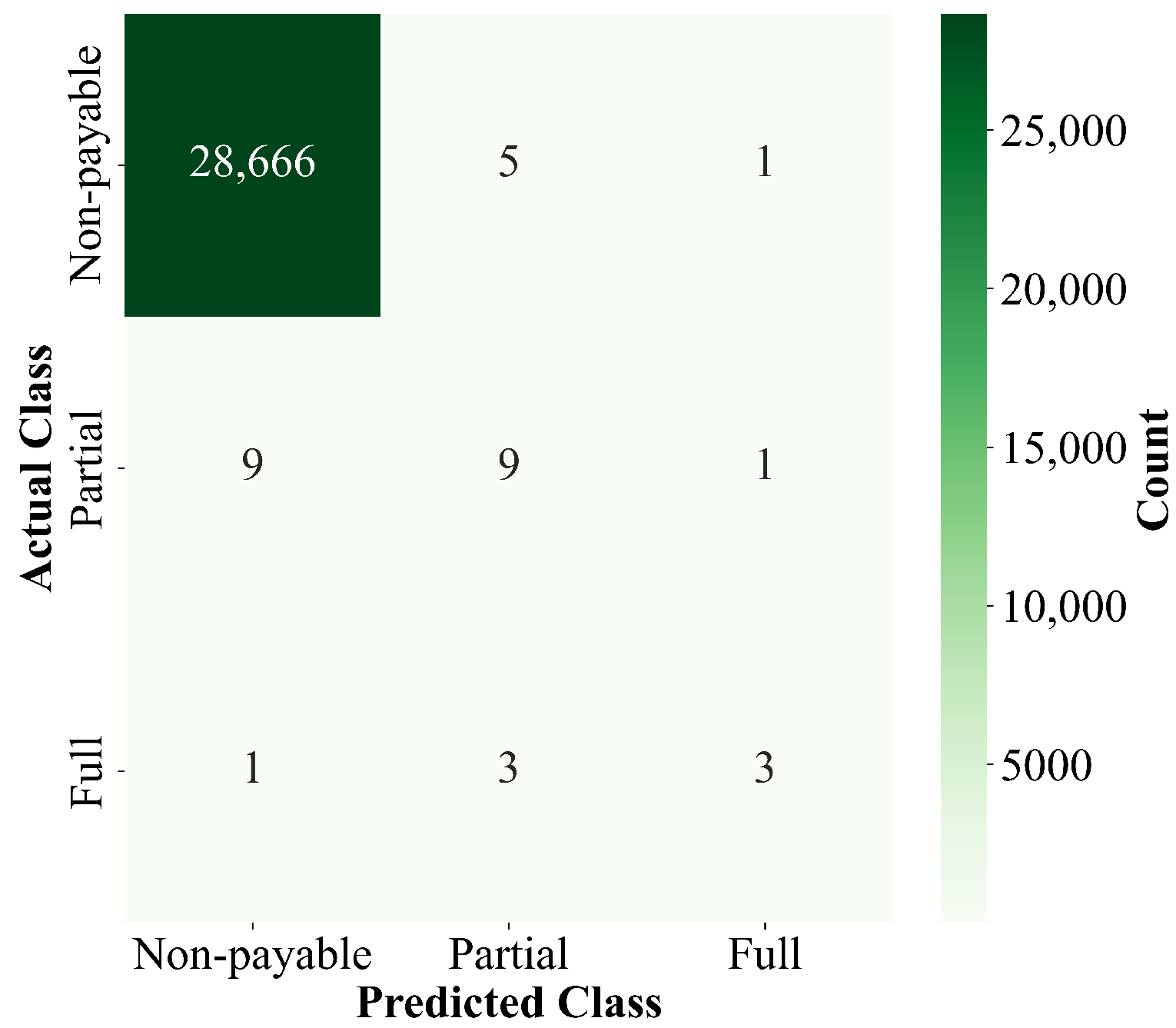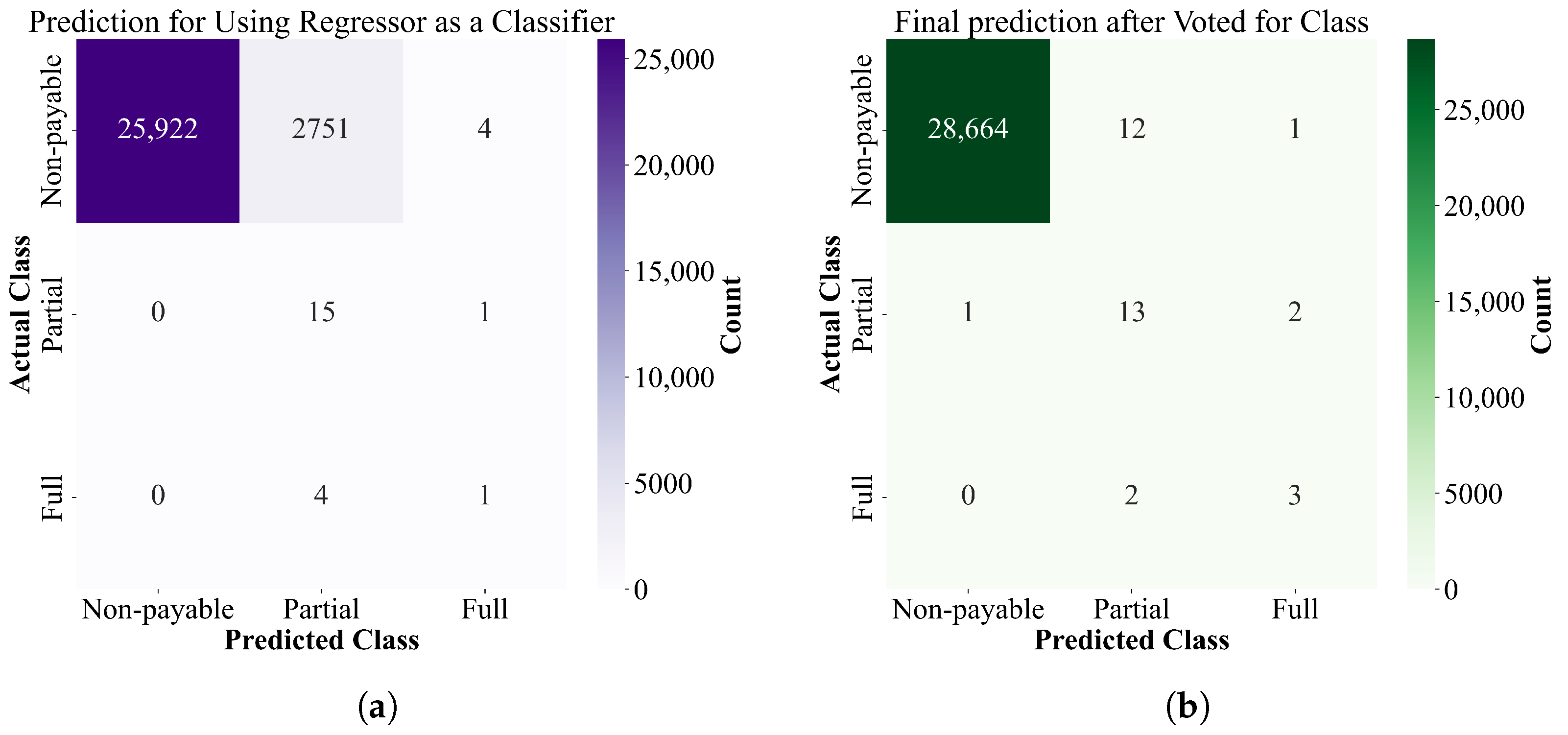 Figure 7a illustrates the performance of the regression model as a classifier. It is interesting to note that for ‘partially payable’ events, the recall of the regression as a classifier is 1, which is significantly higher than the two classifiers dedicated to event classification. The classifications predicted by the regression model are aggregated with the classifications predicted by the two previous classifiers and voted on. The one with the highest number of votes was taken as the final class. As provided in