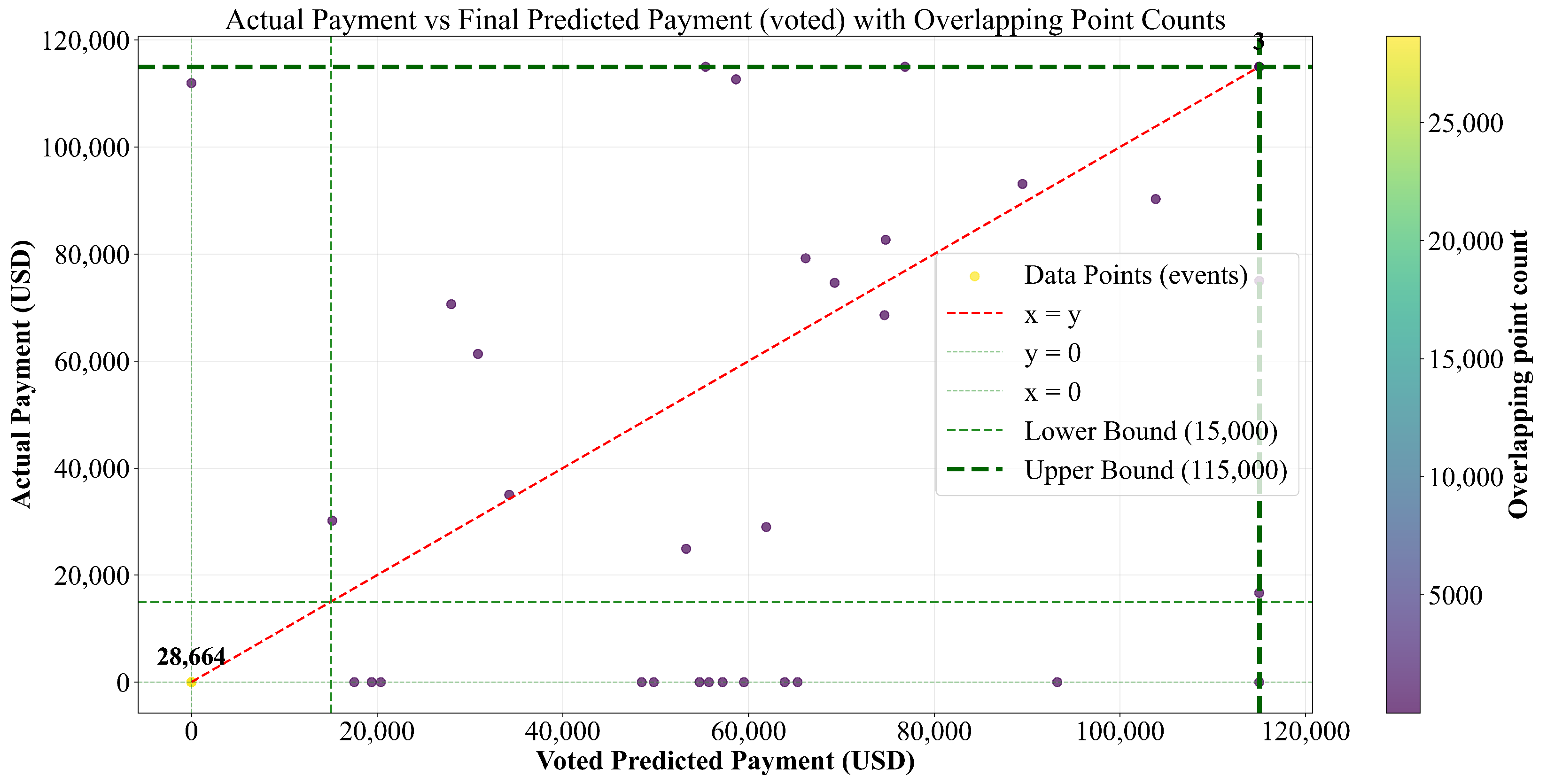 The final predicted payment can be compared to the actual payout adjusted by the lower and upper bounds of the actual loss.