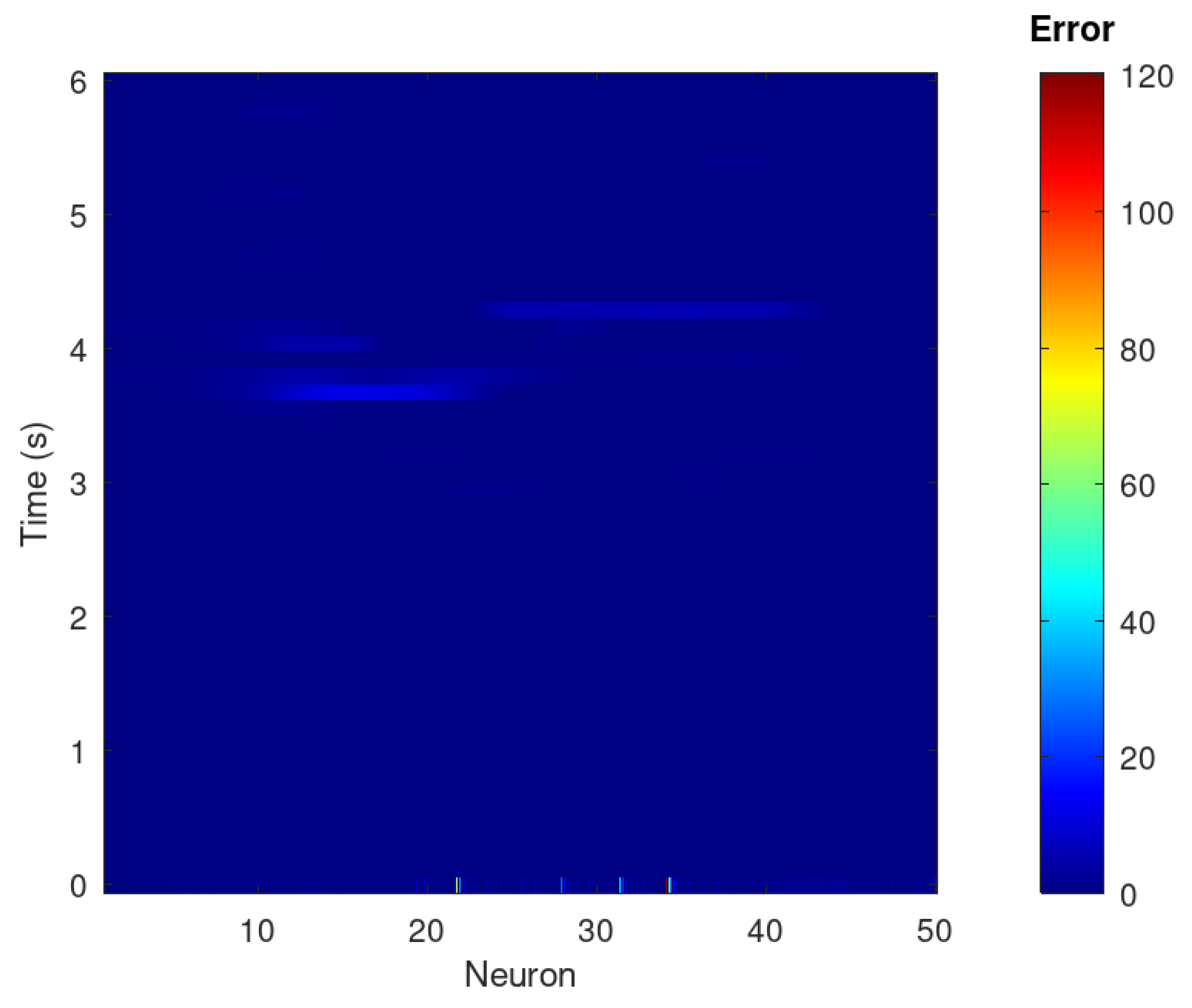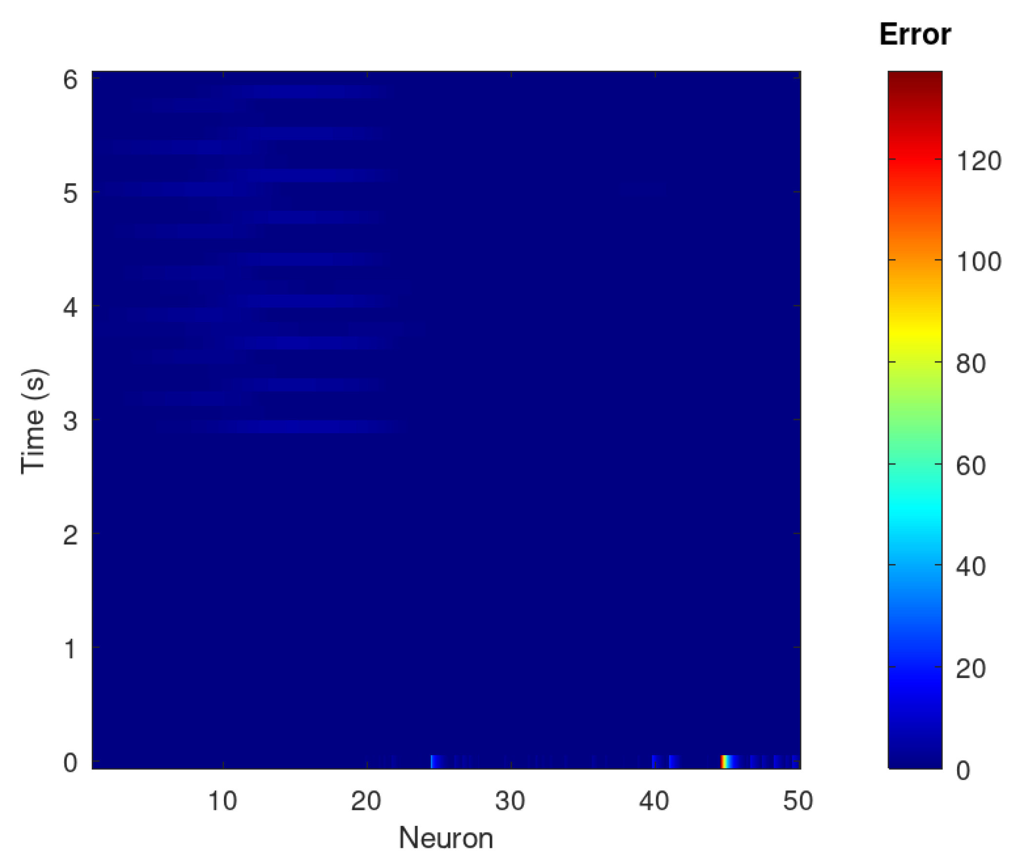 Contour plot of the evolution in time of the error variables of the identical neural network with neurons.