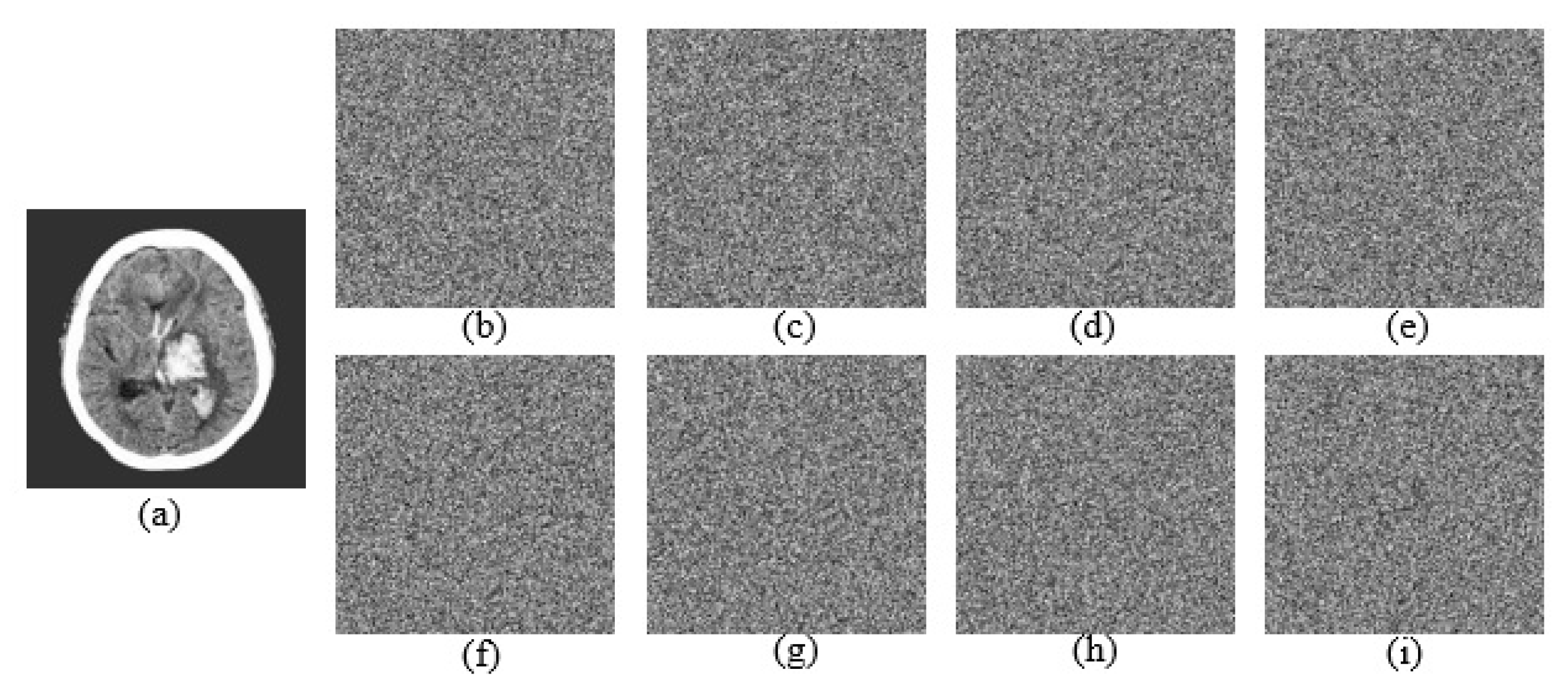 Implementation results of the encryption algorithm based on oscillator with butterfly attractors. (a) Plain image of Cerebral Infarction, (b) plain image of Kidney Cancer, (c) plain image of Intracerebral Hemorrhage, (d) encrypted image of Cerebral Infarction, (e) encrypted image of Kidney Cancer, (f) encrypted image of Intracerebral Hemorrhage, (g) decrypted image of Cerebral Infarction, (h) decrypted image of Kidney Cancer, (i) decrypted image of Intracerebral Hemorrhage.
