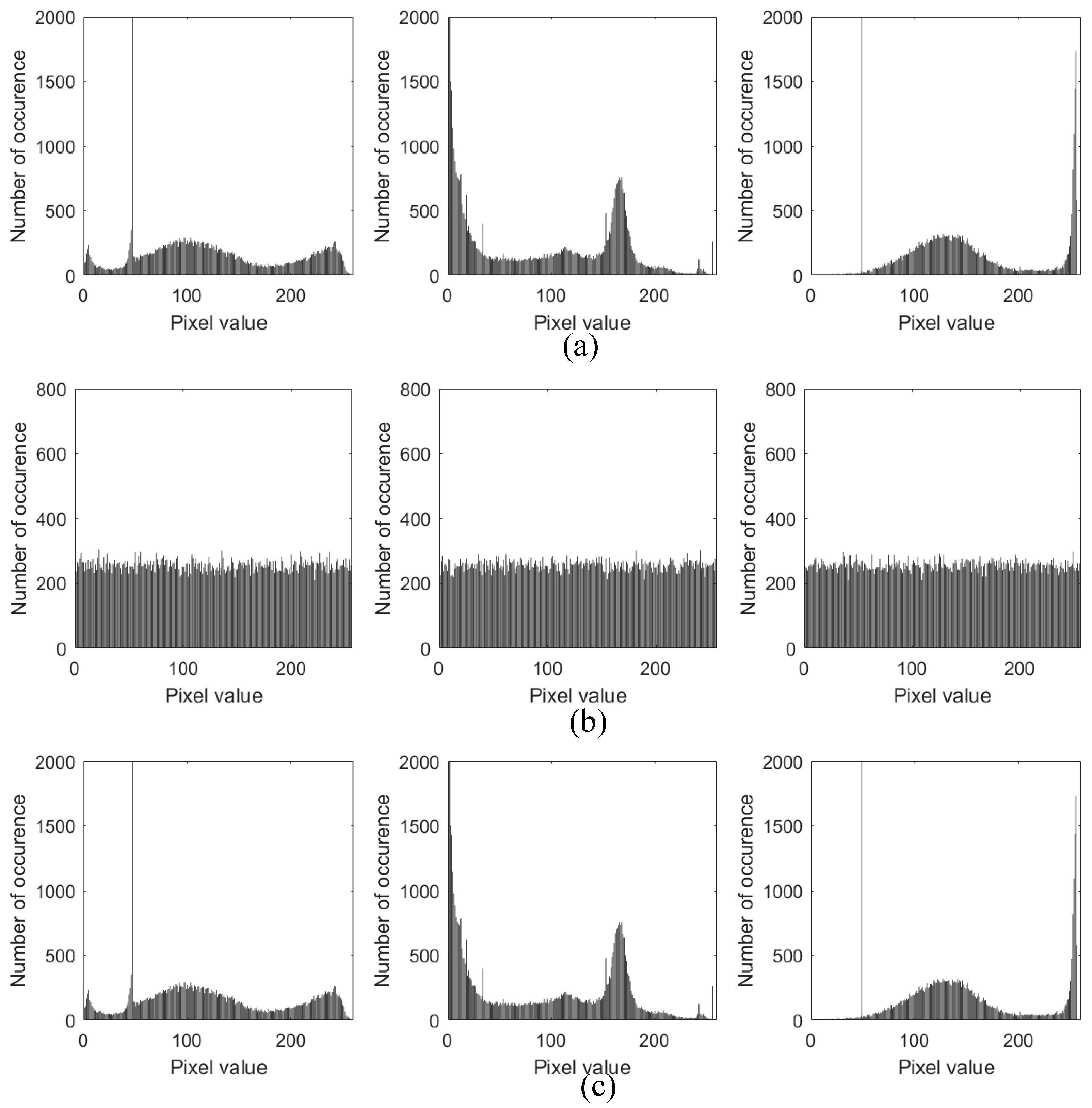 Histogram of input original images (a), encrypted images (b), and decrypted images (c).