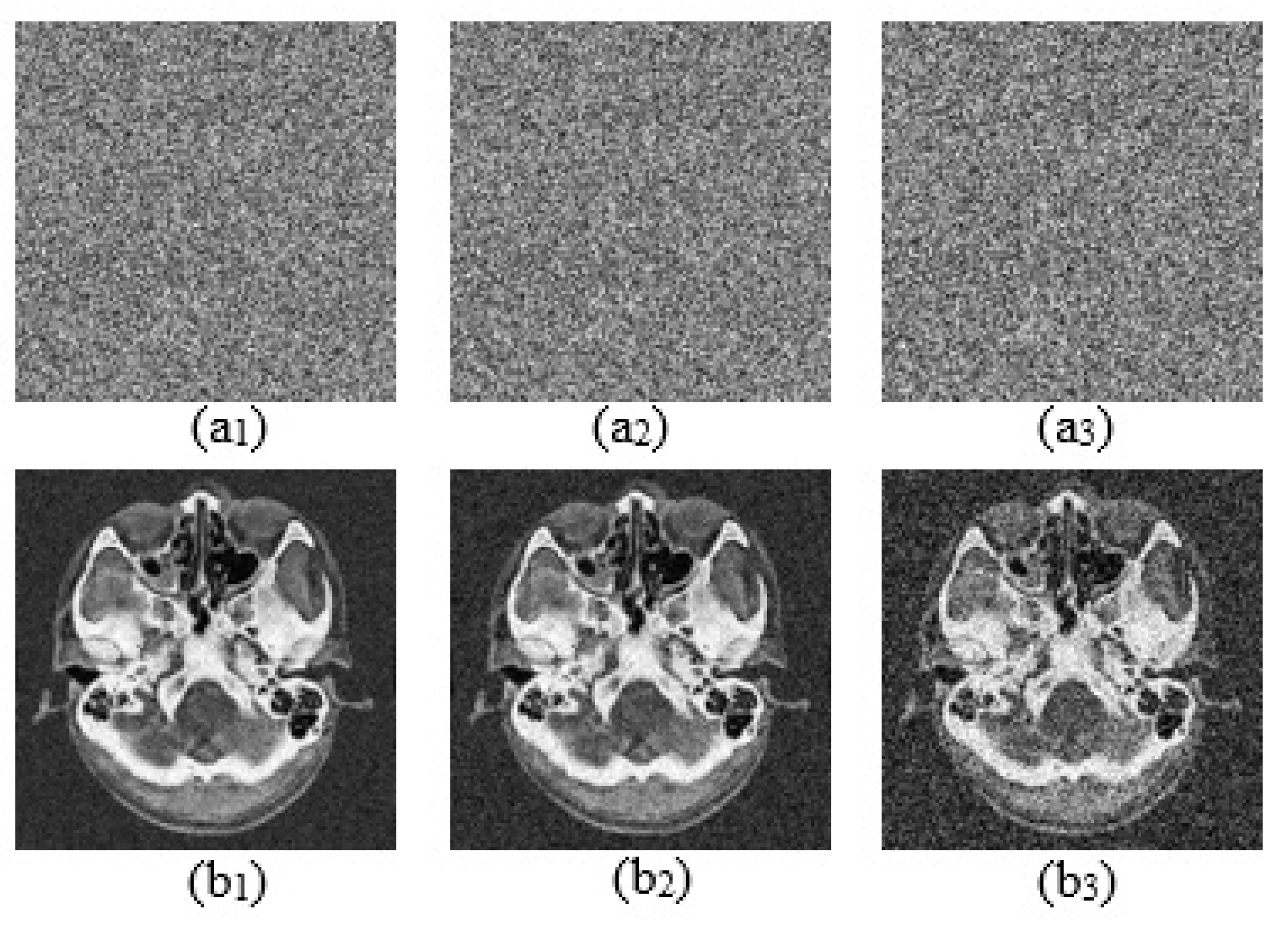 Effects of the Gaussian noise on the performance of the algorithm. (a1–a3) encrypted image with 0.01, 0.05, and 0.1 Gaussian noise, respectively. (b1–b3) Corresponding decrypted images.
