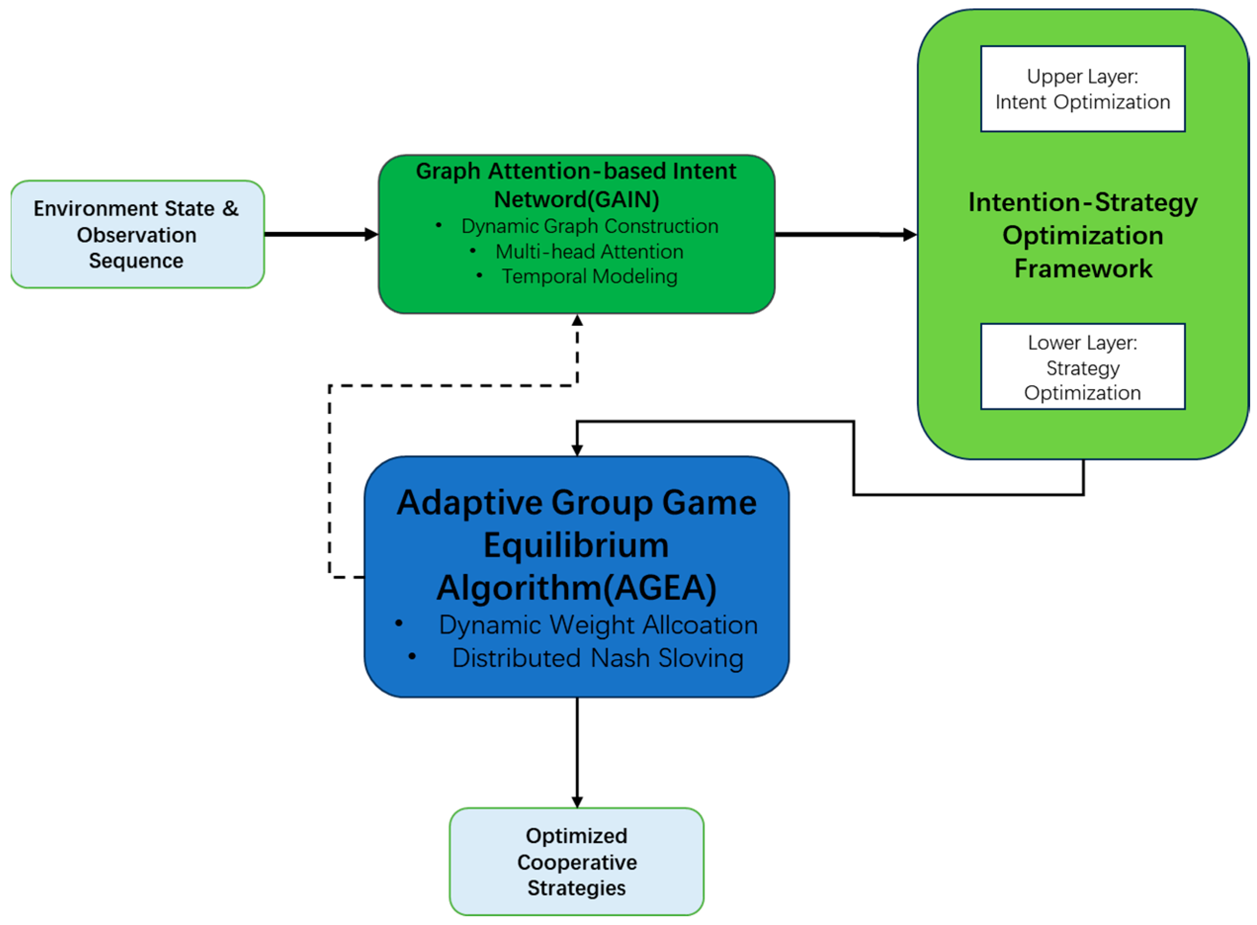 - Theoretical contributions: Established an intention-strategy bi-level optimization theoretical framework, integrating intention recognition and strategy optimization into a unified framework for collaborative evolution; proposed group intention recognition theory based on graph attention, capturing complex intention dependencies through dynamic graph modeling and multi-head attention mechanisms; constructed an intention-aware multi-agent group game model, extending traditional game theory applications by using intention states as prior information for game strategies.