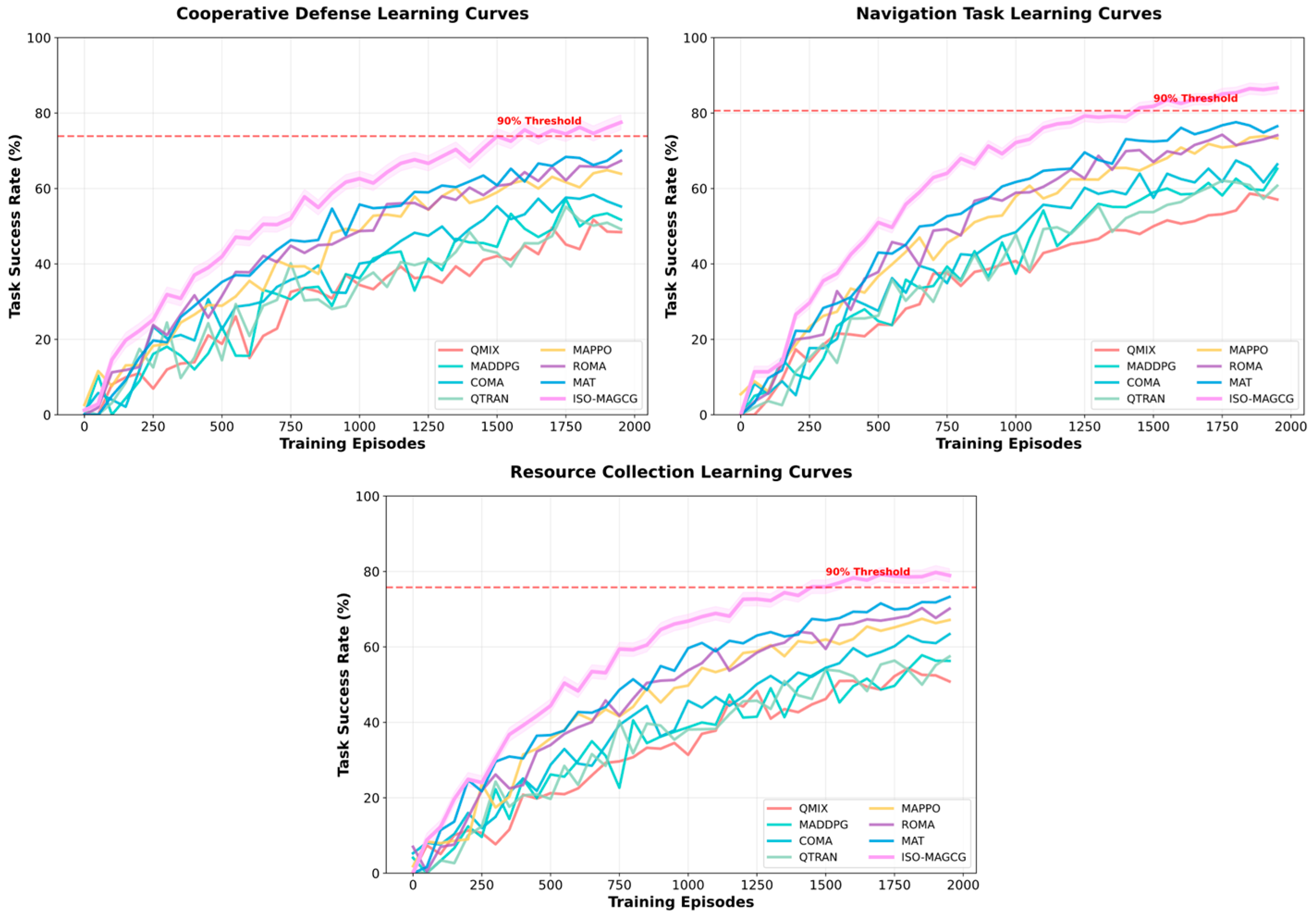 - Experimental validation: Constructed a multi-scenario evaluation system covering navigation, resource collection, and defense cooperation. Compared with five mainstream baseline algorithms, ISO-MAGCG significantly outperforms existing methods in task success rate, cumulative reward, cooperation efficiency, and other metrics, with average task success rate improvement of 8.4%, cooperation efficiency improvement of approximately 12%, and convergence speed improvement of 30%, demonstrating excellent performance advantages and scalability.