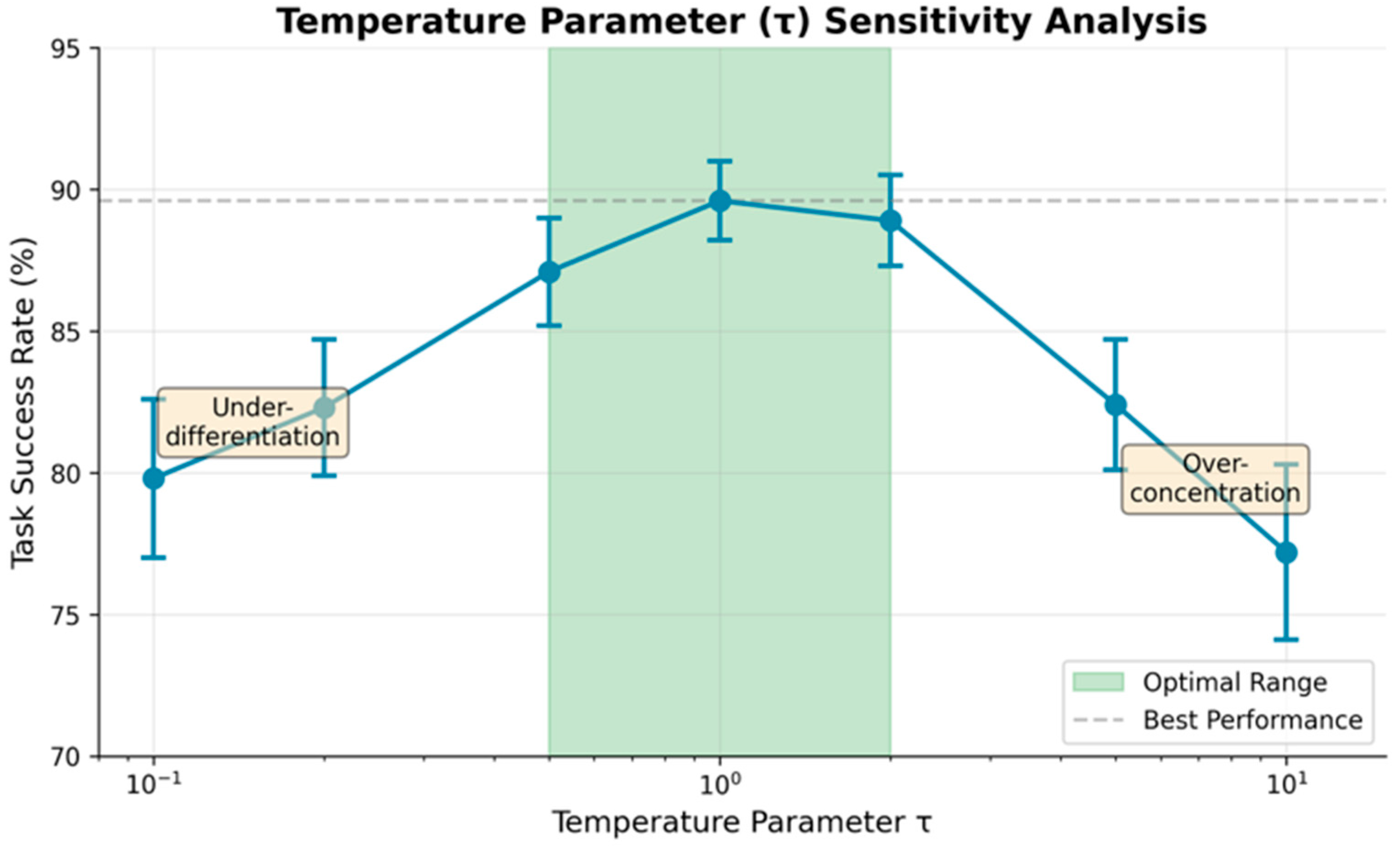 - Under-differentiation (τ < 0.5): Low temperatures produce near-uniform weights regardless of contribution, failing to leverage agent heterogeneity. Performance degrades 8–12%.