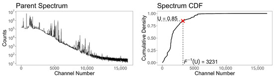 Gamma-ray spectrum acquired using a high-purity germanium (HPGe) detector and a plutonium calibration source (left) and the corresponding cumulative distribution function (CDF) used for inverse-transform subsampling (right). The red ‘X’ marks the value where , indicating that channel 3231 would be incremented for this realization.