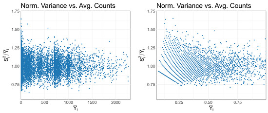 Table 1 presents and associated uncertainty () for the three different cases. Table 2 lists p-values associated with Wilcoxon Signed-Rank Tests conducted comparing for synthetic replicates to that of the genuine replicates. Because the distributions of the normalized variance metrics are skewed and strongly non-Gaussian in low-count regions (Figure 2), we use the Wilcoxon signed-rank test instead of a parametric paired t-test. The Wilcoxon test does not assume normally distributed differences and is more robust than the t-test when the data contain outliers or heavy tails. Other nonparametric alternatives exist, such as the sign test, but the sign test uses only the sign of the paired differences and discards their magnitude, whereas here we care about both the direction and the size of the effect. A significance level of was chosen, and the p-values were adjusted using the Benjamini–Hochberg procedure to control the false discovery rate. While Poisson (naïve), binomial (no replacement) and inverse transform (with replacement) all produce synthetic child spectra where is not significantly different from the genuine spectra, Poisson (variance-corrected) and inverse transform (partial replacement) produce underdispersed and overdispersed children, respectively. These effects are profound when .