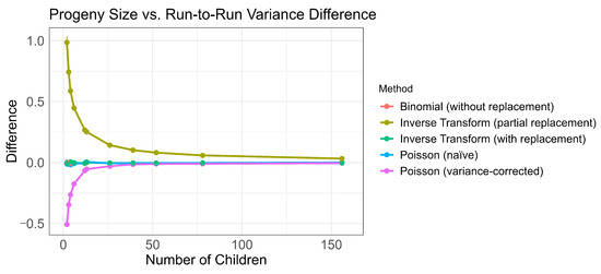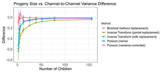 As with run-to-run variance, the bootstrapping procedure was extended to progeny sizes corresponding to and 156. A trend for each method is visualized in Figure 6. All methods approach the correct level of dispersion, but binomial sampling without replacement once again consistently outperforms the other methods across all progeny sizes.