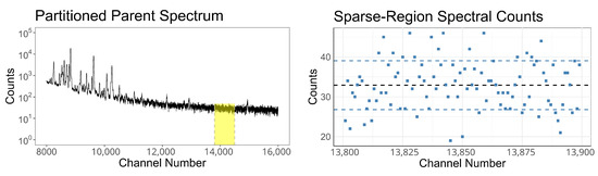 Channel-to-channel variance was studied by focusing on a flat section of the spectrum where no peaks are visible and the relationship between slope and energy is negligible. Additionally, we will select a sparse region with few counts per bin. Sparse spectral regions are of particular interest to researchers in the field of gamma-ray spectroscopy. Accurately representing sparse regions is required for algorithmic spectrum evaluation [20], to understand the naturally present gamma-ray background [21], and to characterize properties of the detector itself. Hence, a good subsampling algorithm must produce child spectra that maintain appropriate variance properties even in the sparse regions. Sparse regions amplify even small statistical artifacts, making them ideal for discriminating among subsampling methods. The chosen region is highlighted in Figure 4 (left) and spans channels 13,800 through 14,500.