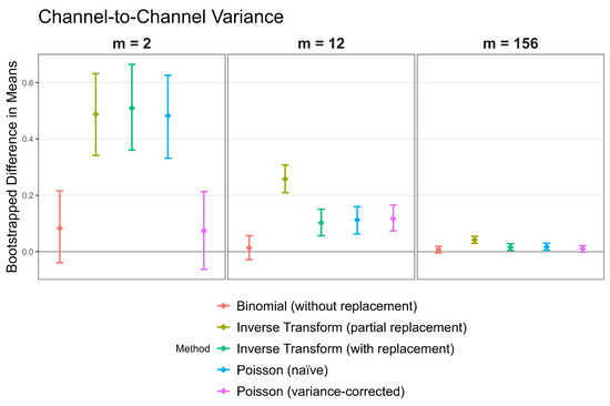 Bootstrapped distributions of mean difference in channel-to-channel variance between synthetic and genuine spectra for , , and . Diamonds denote the median mean difference with error bars representing confidence intervals. Confidence intervals overlapping zero indicate no statistical difference in channel-to-channel variance between the groups. Only binomial sampling without replacement preserves channel-to-channel variance across all tested progeny sizes.