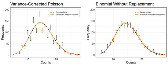 Frequency distributions of counts in the sparse spectral region for . Error bars represent the expected variance of a Poisson variate, and dashed curves show the generalized-Poisson maximum-likelihood fit for the genuine replicates. On the (left) is shown the distribution from variance-corrected Poisson sampling, which exhibits unphysical oscillatory artifacts due to rounding even though the global distribution remains accurate. On the (right) is shown the distribution from binomial sampling without replacement, which matches the desired distribution in all respects.