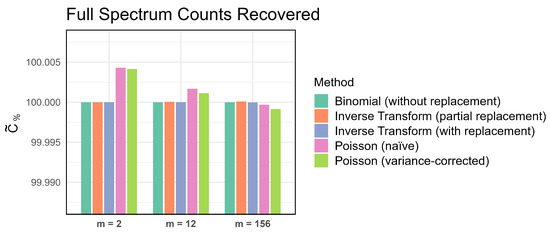 The normalized count total, , is then computed by dividing C by the total counts in the parent spectrum. Values of less than unity indicate a loss of information due to sampling, while values greater than unity indicate that information has been added. In either case, any deviation of from unity indicates that the method is not lossless. Let be the percent of information preserved by the method. Figure 8 compares by method across progeny sizes. Binomial sampling without replacement is perfectly lossless, and the inverse transform methods are both nearly lossless. Both Poisson sampling methods, however, seem to produce more counts than is appropriate for and , and fewer than desired for .