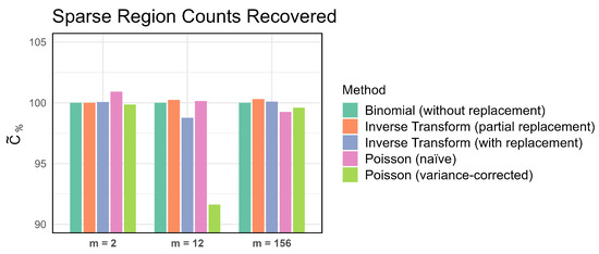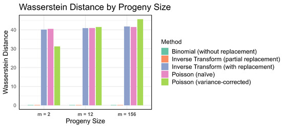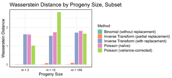 Figure 10 presents a barplot of Wasserstein distance across methods for all progeny sizes while Figure 11 presents a barplot of Wasserstein distance across methods for the sparse region. Binomial sampling without replacement perfectly reconstructs the original data. inverse transform sampling with partial replacement consistently has the second-smallest Wasserstein distance (less than 0.05 for all progeny sizes) and is barely visible on the plot. The remaining three methods were not significantly different from one another. We also compared Wasserstein distance across sampling scenarios for the subset region and obtained similar results. Consistent with the test of summarized in Figure 9, variance-corrected Poisson sampling performed much worse than the other methods when . As expected, binomial sampling without replacement consistently outperforms all other methods on the Wasserstein metric, with inverse transform sampling with partial replacement a close second.