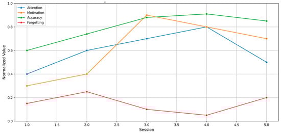 The Pedagogical Decision Engine Converts estimated cognitive states to adaptive instructional actions. Figure 7 represents the shifts of attention, motivation, and forgetting over the sessions, with most periods of positive transfers and some periods of negative transfers.