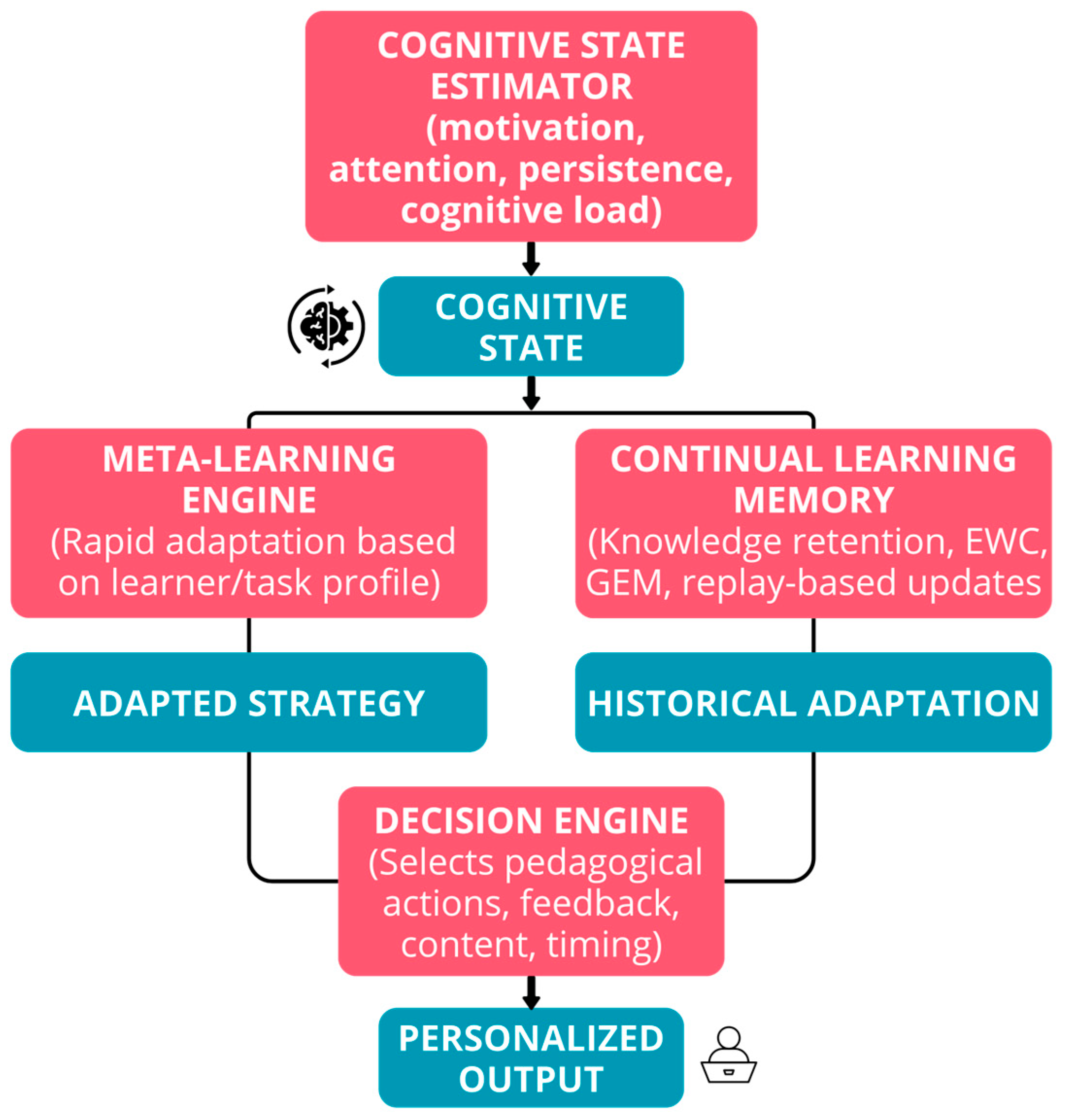 18]. Neither of these two streams of research is aimed at taking this operationalized SRL modeling, meta-learning, and continual learning jointly in a single closed-loop architecture to target both short-term and long-term personalization in intelligent educational systems, as far as we know.