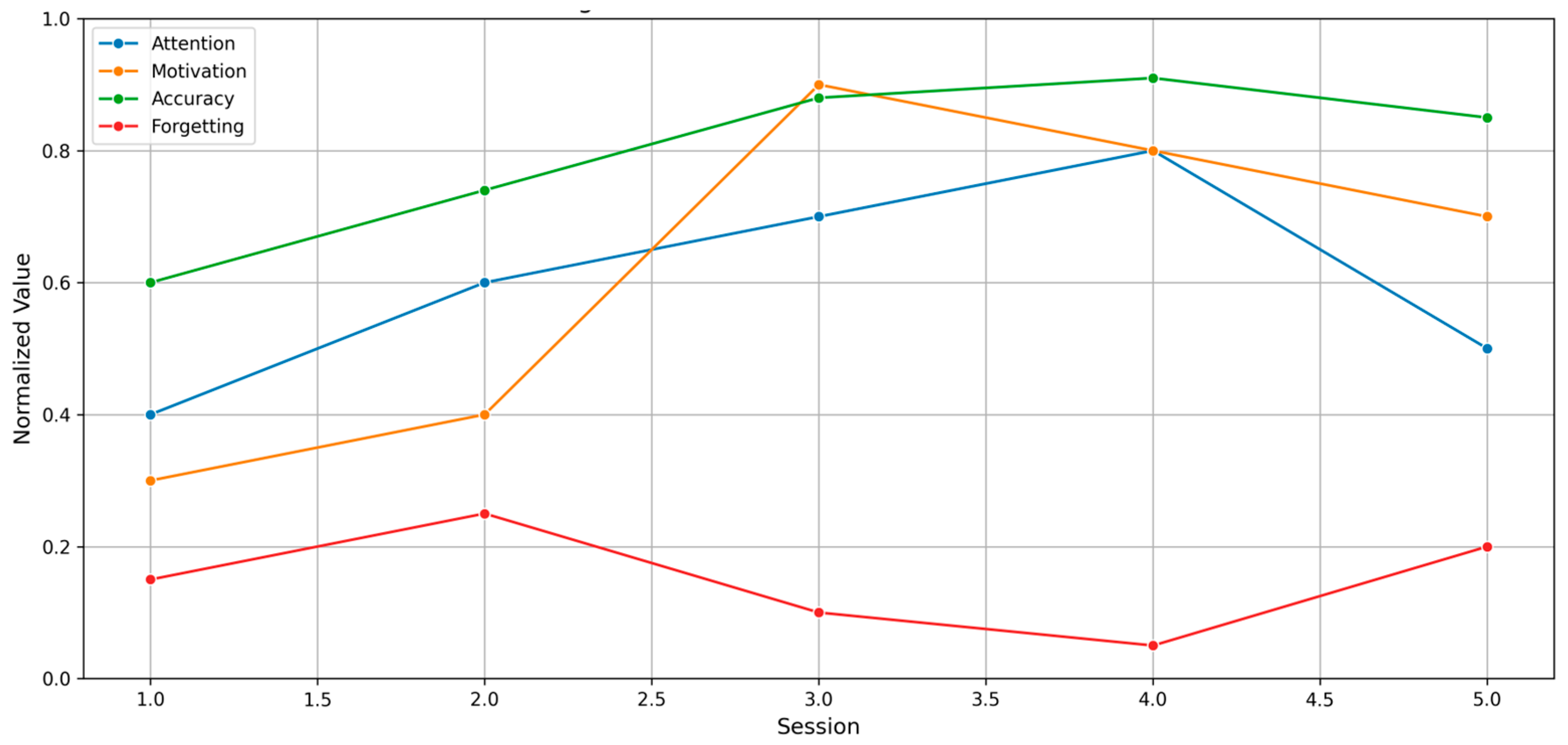 Figure 7 represents the shifts of attention, motivation, and forgetting over the sessions, with most periods of positive transfers and some periods of negative transfers.
