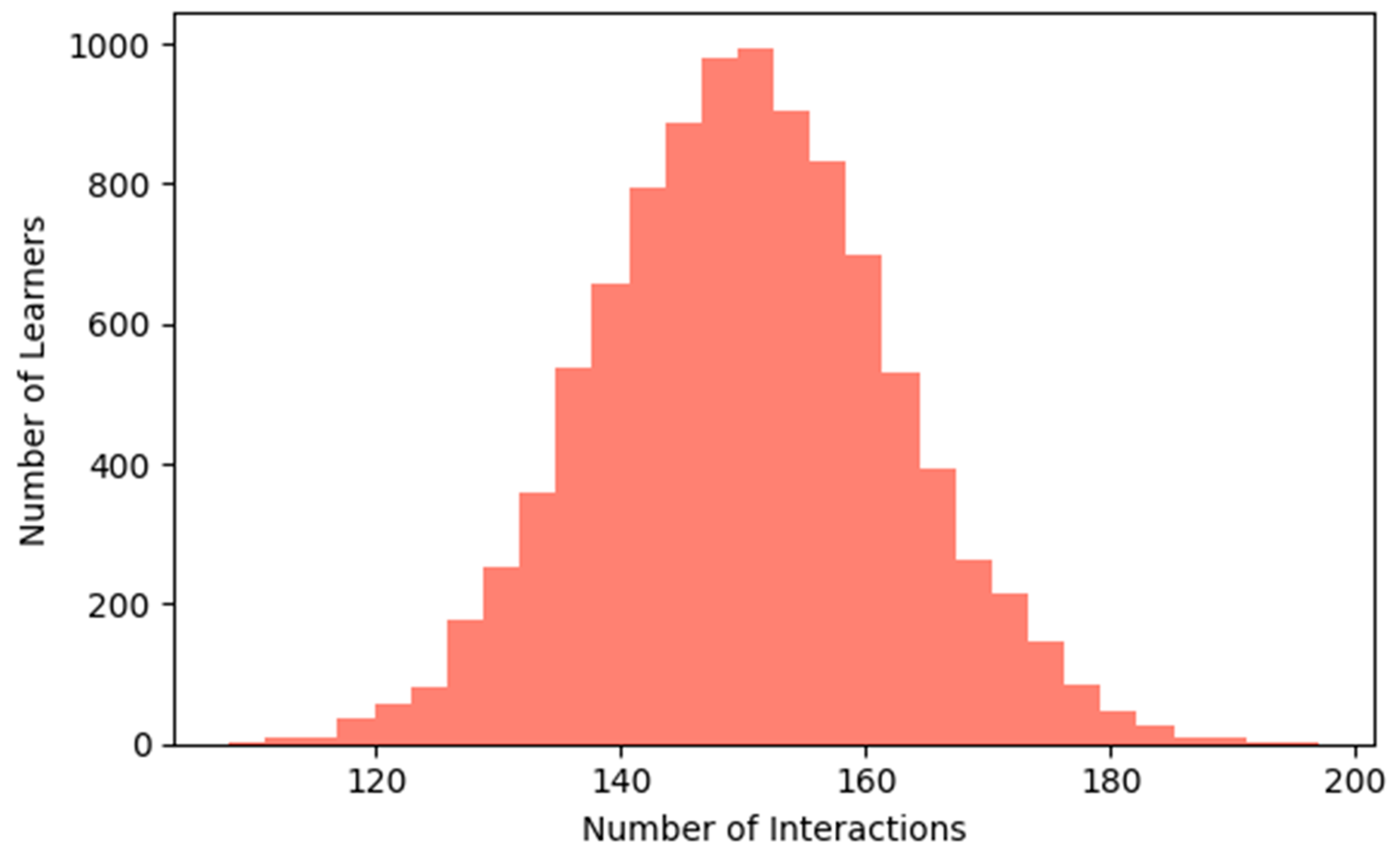 Figure 11). It is a heavy-tailed distribution in that, whereas most of the learners have around 120–180 interactions, more learners are much more active. This feature makes this property ideal for continual learning techniques (e.g., EWC, Replay) since it provides long shapely sequences for some learners, while also providing short sequences for fast-adapting analysis.