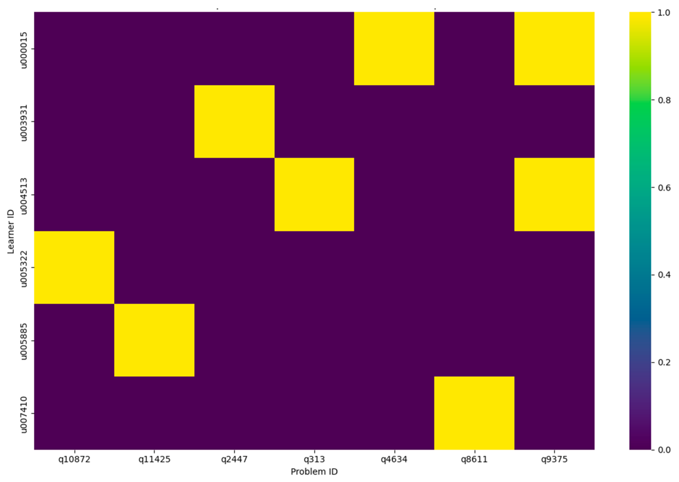 Finally, a sparse learner problem interaction heatmap illustrates the structural sparsity present in large educational datasets, where each learner interacts with only a small fraction of the available item pool. This sparsity strengthens the necessity of the core mechanisms of representation learning, episodic memory, and adaptive meta-learning encoded in CAMEL (