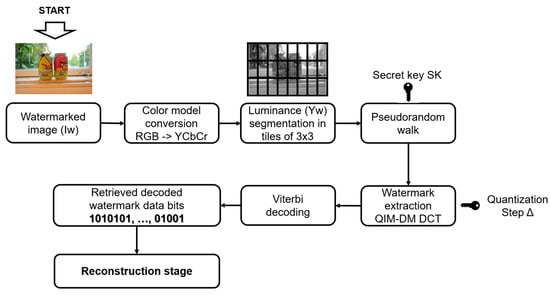 The reconstruction procedure of the watermark’s information is shown in Figure 4 and explained in the following paragraphs.