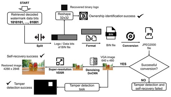 Currently, advances in communication and information technologies allow for generating, capturing, editing, storing, and sharing high-resolution color images in a massive and immediate manner. In this way, supported by software edition tools integrated into smartphones and personal computers, end users can perform image editing for artistic purposes or image enhancement. However, when image editing is done to alter the content maliciously, such as removing or adding non-existent elements to the original version, and the tampered version is shared, socialized, or transmitted without the image owner’s approval, it can result in moral or economic harm. Conventional informatics security tools cannot solve all information security issues related to tamper detection and ownership authentication of color images. Consequently, the field of data hiding has been extensively studied to embed logos or text within color images, thereby establishing a trustworthy link between the hidden information and the visual content. Within the scope of this paper and the spectrum of data hiding techniques, we identified a method known as digital watermarking, which, in general terms, involves embedding or concealing binary data associated with multimedia ownership to ensure copyright protection and safeguard intellectual property [1,2]. Digital watermarking algorithms typically need to address three fundamental requirements: imperceptibility, robustness, and payload capacity. They are often structured into three stages: embedding, detection or extraction, and watermark generation [3]. The imperceptibility criterion pertains to assessing the visual distortion produced during the embedding stage. Robustness denotes the watermark signal’s resilience to signal processing distortions beyond which recovery or detection becomes unfeasible. The payload denotes the quantity of data bits that can be incorporated during the embedding phase without compromising imperceptibility and robustness [4]. Digital watermarking is classified into different modalities, including fragile, semi-fragile, and robust, each providing a specific performance based on its design and the significance of the aforementioned requirements [5,6,7,8,9]. Fragile watermarking algorithms focus on imperceptibility and payload capacity but generally lack consideration for robustness, whereas robust techniques prioritize robustness but often at the expense of imperceptibility and payload. Conversely, semi-fragile watermarking schemes are explicitly engineered to withstand specified benign image processing operations without compromising the integrity of the watermark. These procedures frequently involve a range of distortions, including both lossy and lossless compression, noise interference, filtering, and file format transformation. Crucially, the essential criteria for imperceptibility (invisibility) and payload (data capacity) maintain the same critical level of importance as those defined for fragile watermarking techniques. Whether the design is fragile, semi-fragile, or robust, within the scope of digital image forgery and tampering, a primary challenge lies in developing a watermarking algorithm that not only effectively detects tampering but also possesses the capability to recover and restore as much of the tampered content as possible. Numerous watermarking methods for forgery and tamper detection have been documented in the scientific literature, categorized as fragile [10,11,12,13,14,15,16], semi-fragile [17,18,19,20,21,22], robust [23,24,25,26,27], and hybrid (robust/fragile) [28,29,30,31,32,33,34,35]. This paper presents a semi-fragile watermarking algorithm for high-resolution color images that uses watermarking in the discrete cosine transform (DCT) domain through quantization index modulation by dither modulation (QIM-DM) [36,37]. This algorithm also incorporates convolutional encoding with Viterbi decoding [38,39], a denoising convolutional neural network (DnCNN) [40,41], and a very-deep super-resolution neural network (VDSR) [42,43], to facilitate ownership authentication via a binary logo watermark. To achieve tamper detection and self-recovery, a thumbnail image is created by rescaling the original color image to a standard VGA resolution [44] and compressing it using the JPEG2000 lossy algorithm [45,46]. By its design, the proposed method can increase the information security capabilities mentioned above by having a multipurpose watermarking algorithm. The results of the tests performed highlight the contribution of the proposed method.