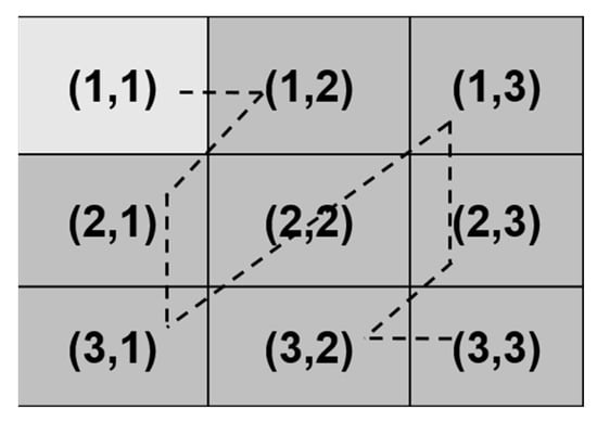 Once the values for block segmentation and the amount of data to be embedded in the DCT domain are established, the next step is to select two AC coefficients from the 3 × 3 DCT block for the embedding procedure. To accomplish this, we utilize a zig-zag scan, as illustrated in Figure 6, which represents a truncated version of the traditional zig-zag scan.