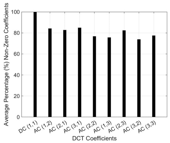 Experimentally, we applied JPEG lossy compression with a quality factor of 70 and utilized 3 × 3 block segmentation in the DCT domain. We then compressed all images in the dataset and calculated the average percentage of non-zero direct current (DC) and AC coefficients, as shown in Figure 7.