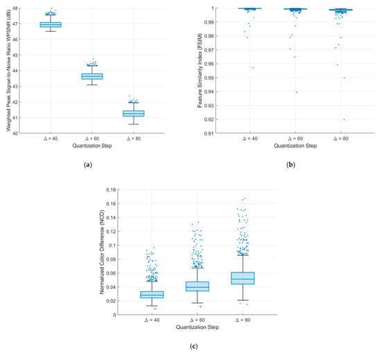 (a) WPSNR, (b) FSIM, and (c) NCD values for quantization steps ∆ 40, 60, and 80, obtained in all images in the dataset.