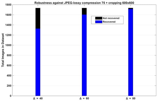 To determine the appropriate quantization step ∆ used in QIM-DM [36,37] within the 2D-DCT frequency domain, we examine the parameter settings detailed in Section 4.2.1 and Section 4.2.2. We will also consider a variable range for ∆, specifically from 40 to 80.