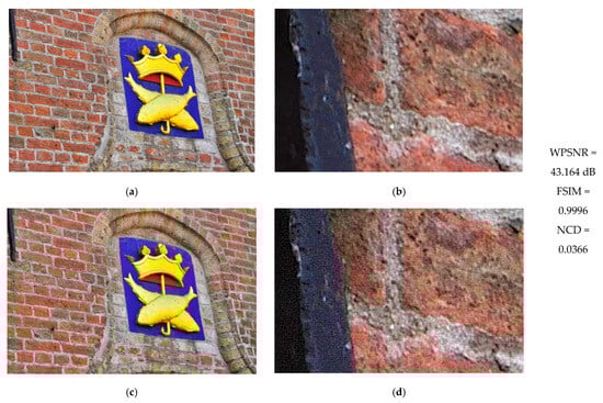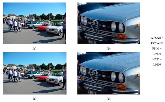 As demonstrated in Figure 10a,c and Figure 11a,c, the watermark remains imperceptible under predefined viewing conditions on electronic devices such as laptops or smartphones, as confirmed by the WPSNR, FSIM, and NCD results. Conversely, Figure 10 and Figure 11d illustrate the visual degradation that occurs when the image is zoomed in to 300% or more. This test is intended for illustrative purposes only, given that it is uncommon to zoom in beyond 100% on digital images displayed on devices like laptops, tablets, or smartphones.
