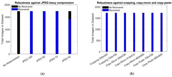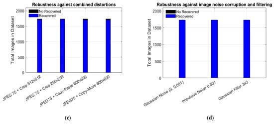 Robustness against: (a) Unwatermarked and JPEG lossy compression, (b) Cropping, copy–move and copy–paste, (c) combined distortions and, (d) image noise corruption and filtering.