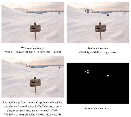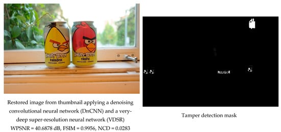 Step 6. Once the tamper detection has been performed, the final process is restoring the image file I’JP2-VGA to as high a visual fidelity as possible to the original spatial resolution of M × N pixels in size to view the lost content from the tampered watermarked version with the naked eye. To accomplish this aim, we are supported by two deep learning pretrained models: a denoising convolutional neural network (DnCNN) [40,41] and a very-deep super-resolution neural network (VDSR) [42,43]. Since both models are well-known and established, details of the architecture can refer to [40,41,42,43]. In this way, to diminish the effect of rippling and blocking artifacts caused by the JPEG2000 lossy compression, the model DnCNN is applied to I’JP2-VGA. Finally, the denoised version is rescaled to M × N via the model VDSR, obtaining the restored image I’r.