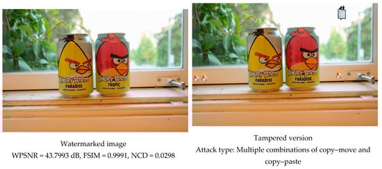 The goal of this experiment is to visualize the performance of the proposed semi-fragile watermarking technique concerning self-recovery and tamper detection. For brevity, Figure 13, Figure 14 and Figure 15 present the experimental results when the watermarked image undergoes manipulation through multiple copy–moves, extensive copy–pasting, and various combinations of both techniques. It is important to note that the color images used have a resolution of 4288 × 2848 pixels and a color bit depth of 24 bits per pixel. Based on the experimental findings, we would like to emphasize several key aspects of our proposal: (a) The proposed method extends beyond simply generating a tamper detection mask. (b) It possesses self-recovery capabilities that include color information, maintaining the original spatial and bit depth resolutions. (c) The visual quality of the restored color image is preserved to the greatest extent possible, as indicated by the WPSNR, FSIM, and NCD metrics. These metrics demonstrate the advantages of employing a denoising convolutional neural network (DnCNN) and a very deep super-resolution neural network (VDSR). Although Figure 13, Figure 14 and Figure 15 indicate that the tamper detection mask exhibits low precision, the primary aim of this work is to identify tampered regions, even with low accuracy. The mask serves primarily for illustrative purposes and as an additional feature. The restored color image allows the naked eye to discern the forgery content, which is a notable highlight of the proposed method.