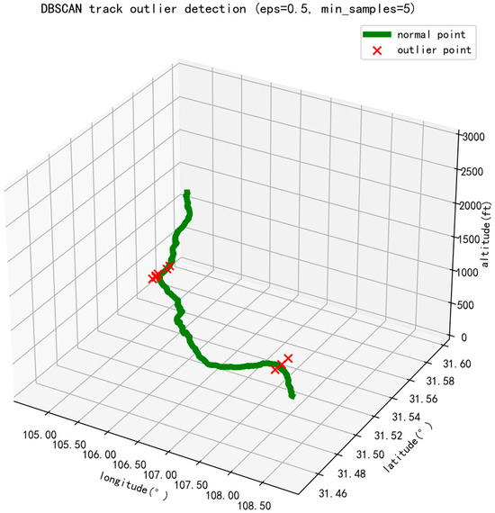 This paper takes the UAV data under the integrated operation of Zigong Airport. Based on the spatial resolution of ADS-B coordinates and the data-driven selection of typical positioning errors, eps = 0.5 is selected. According to the data update rate of the UAV and the requirements of the continuous trajectory segment, min_sample = 5 is selected for timing reasoning. The sensitivity analysis to ensure the robustness of these parameters is briefly mentioned, indicating that they achieve the best balance between noise removal and trajectory retention. The processing results of track outliers are as follows (Figure 1).