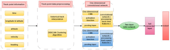 Among them, when the time is , the track A has the characteristics of time and precision (, , , etc.), and the time series tensor is used as the input format. In order to strengthen the calculation ability and accuracy, the continuous track point information is used to predict the next target track point information in the future, and the number of continuous track points is set to 6.