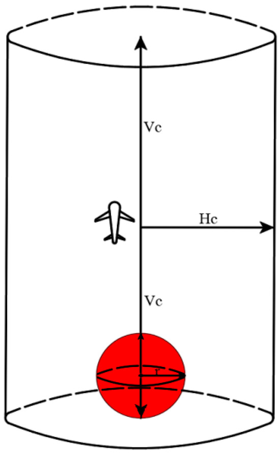 The UAV is treated as a particle, and a composite conflict-detection security area is constructed by superimposing the UAV conflict-detection security area and the navigation aircraft detection protection area. The protected area model for aircraft includes a sphere, a cylinder, and a cuboid. Due to the relatively low space occupancy rate of the sphere, the drone detection area is defined as a sphere with a radius r, the navigation aircraft detection protection area is a cylinder with a radius Hc and a height of 2, and the red warning area is the conflict detection area, as shown in Figure 3.