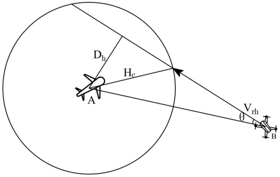 Here, and are horizontal and vertical distance functions, respectively. and are the latitude and longitude positions of manned aircraft A and UAV B at time ; and are the horizontal and vertical spacing standards set by the terminal area control center, and is the coefficient set to meet different early warning needs. Therefore, when the detection function output indicates that a potential conflict is detected, an early warning mechanism needs to be triggered; when the detection function output indicates that the safety interval requirements are met, no early warning is required.