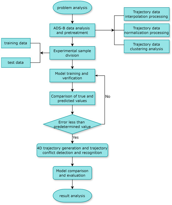 With the continuous upgrading of communication, navigation, surveillance, and airborne equipment, as well as the development of computer technology and data mining methods, more and more data-driven methods have emerged. In view of the actual conflict between the UAV and the manned aircraft at the navigation airport, the combination of trajectory prediction and conflict detection based on machine learning has certain effectiveness [7]. The use of machine learning algorithms for trajectory prediction is to transform the trajectory prediction problem into an ordered time series prediction problem and establish a prediction model by analyzing the relationship between data in the trajectory training set. Wu [8] studied a four-dimensional trajectory prediction model based on a Back Propagation (BP) neural network. The predicted four-dimensional trajectory closely matches the real flight data and is highly accurate. HAN et al. [9] proposed a short-term real-time trajectory coordinate point prediction method based on Gated Recurrent Unit (GRU), which verifies that the GRU neural network has obvious advantages in prediction accuracy and applicability. Shi et al. [10] proposed using the Long Short-Term Memory (LSTM) model for trajectory prediction, accounting for the influence of various factors on track data during the real-time flight process, thereby achieving higher accuracy for the target trajectory. Zhang et al. [11] proposed a 4D trajectory joint-prediction model based on a genetic algorithm. The model is dynamically weighted by a genetic algorithm, enabling accurate prediction of the UAV’s trajectory and the time of entry into the protected area. Han Ping et al. [12] proposed combining the Density-Based Spatial Clustering of Applications with Noise (DBSCAN) algorithm with the GRU algorithm to predict trajectories in the terminal area. The DBSCAN clustering algorithm is used to cluster trajectories in the terminal area, providing a new solution to the trajectory prediction problem in complex airspace. Research on aircraft flight conflict detection technology in complex airspace at home and abroad is mainly divided into geometric-determination and probability-analysis types. Liu Yang et al. [13] proposed an approximate analytical algorithm to calculate the short-term instantaneous collision probability between aircraft, achieving sufficient accuracy and meeting real-time requirements. Miao et al. [14] proposed a new low-altitude flight conflict-detection algorithm based on a multi-level spatio-temporal grid index. This transforms the traditional path-by-path traversal calculation into a conflict-state query in a distributed database, enabling conflict detection results to be calculated across different paths. Mou [15] proposed a dynamic distance buffer suitable for conflict detection, which not only reduces the missed-alarm rate but is also better suited to high-density, high-flow traffic. Wang Lili et al. [16] established a speed–obstacle conflict detection model. For conflict detection in flight, drones actively provide avoidance for manned aircraft that may have a collision risk. Yue Rentian et al. [17] used an improved Kalman filter to predict the trajectory and a three-dimensional deterministic conflict detection model to detect conflicts between the two aircraft and provide a conflict resolution strategy. Hu et al. [18] proposed a PPO-based deep reinforcement learning model for UAS obstacle avoidance guidance. By mapping the continuous state space to continuous heading and speed control via a scenario-state representation and a reward function, the model enables the UAS to reach destinations while bypassing obstacles. Experiments on static/moving obstacles (accounting for environmental uncertainties and safety bounds) show it achieves a>99% conflict-resolution success rate, supporting UAM and UTM safety with high computational efficiency. Nan et al. [19] proposed the TRGPS meta-model for digital service network requirements. To resolve goal conflicts from service integration during evolution, they developed an automatic detection/resolution approach integrating LLMs and TRGPS, using Chain of Thought (CoT) prompting and conflict rules to enable LLM-based conflict reasoning and resolution recommendations. A supporting visualization tool and qualitative experiments validate its effectiveness.